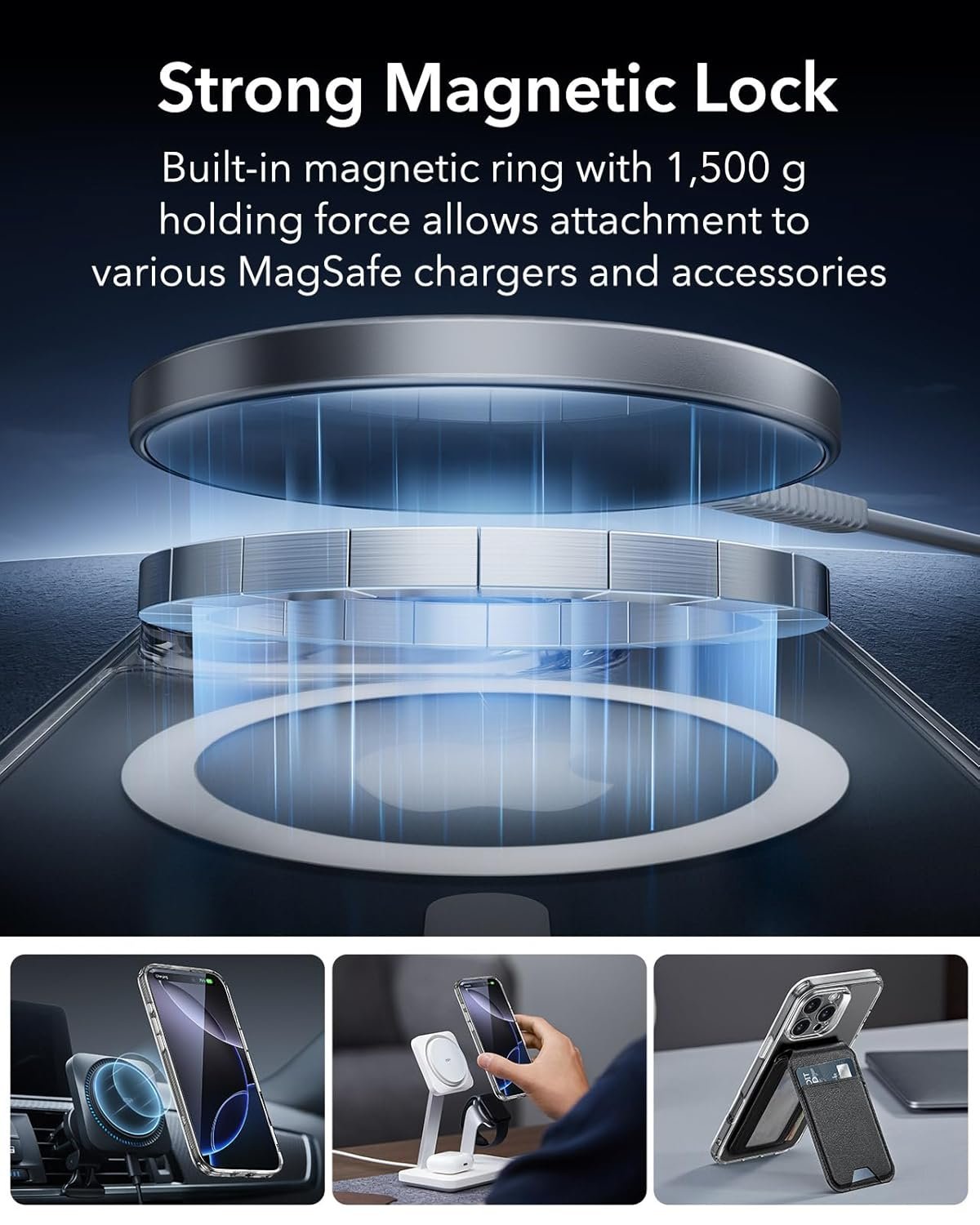 Stronger Magnetic Lock: powerful ring of magnets with 1,500 g of holding force enables faster, easier place-and-go wireless charging and a secure lock on any MagSafe accessory