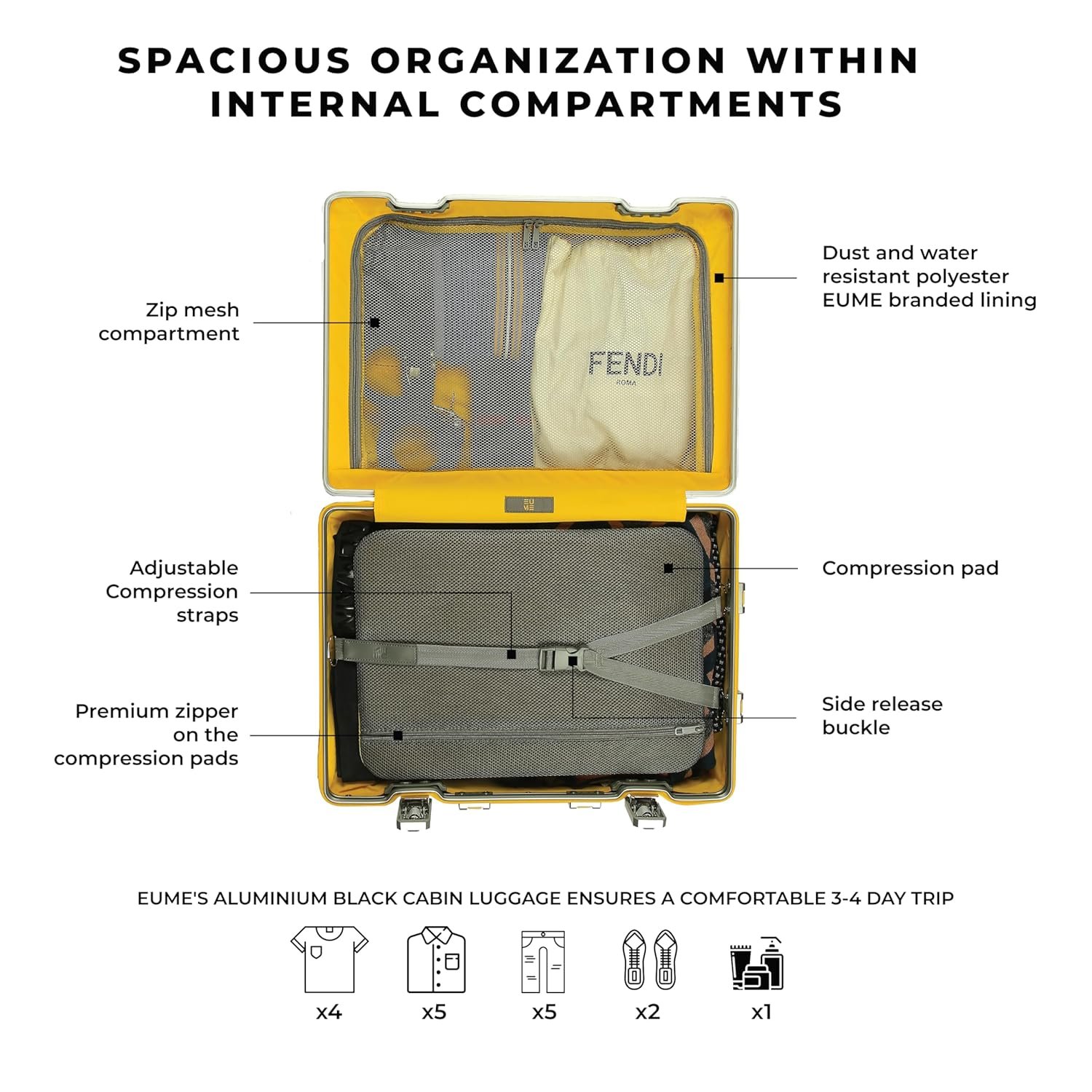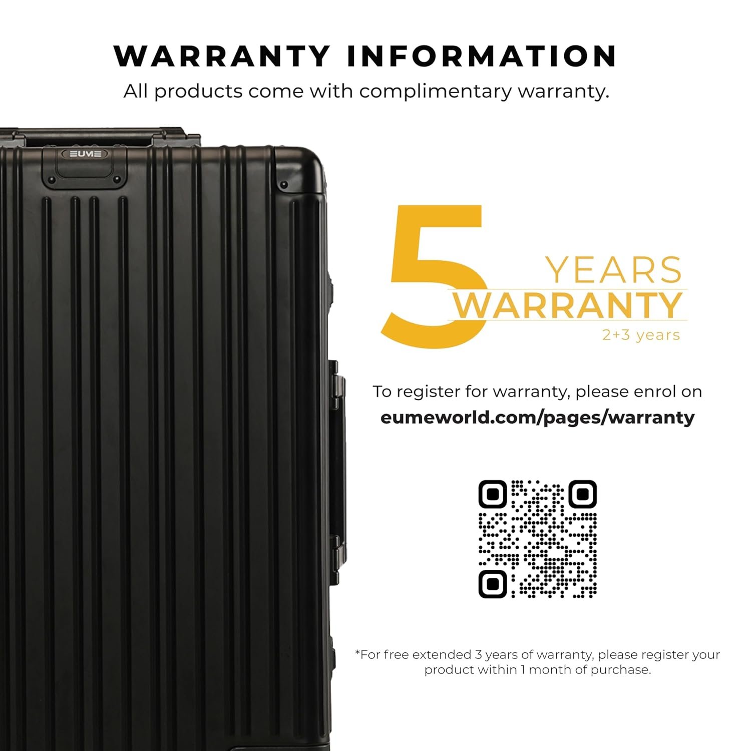 The Eume Aluminium Cabin Luggage comes with a 5-Year Warranty by EUME against manufacturing defects. Register your product within 1 month of purchase to enjoy an extended 3-year warranty for free.