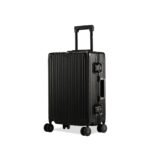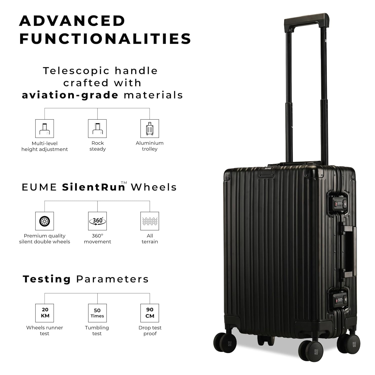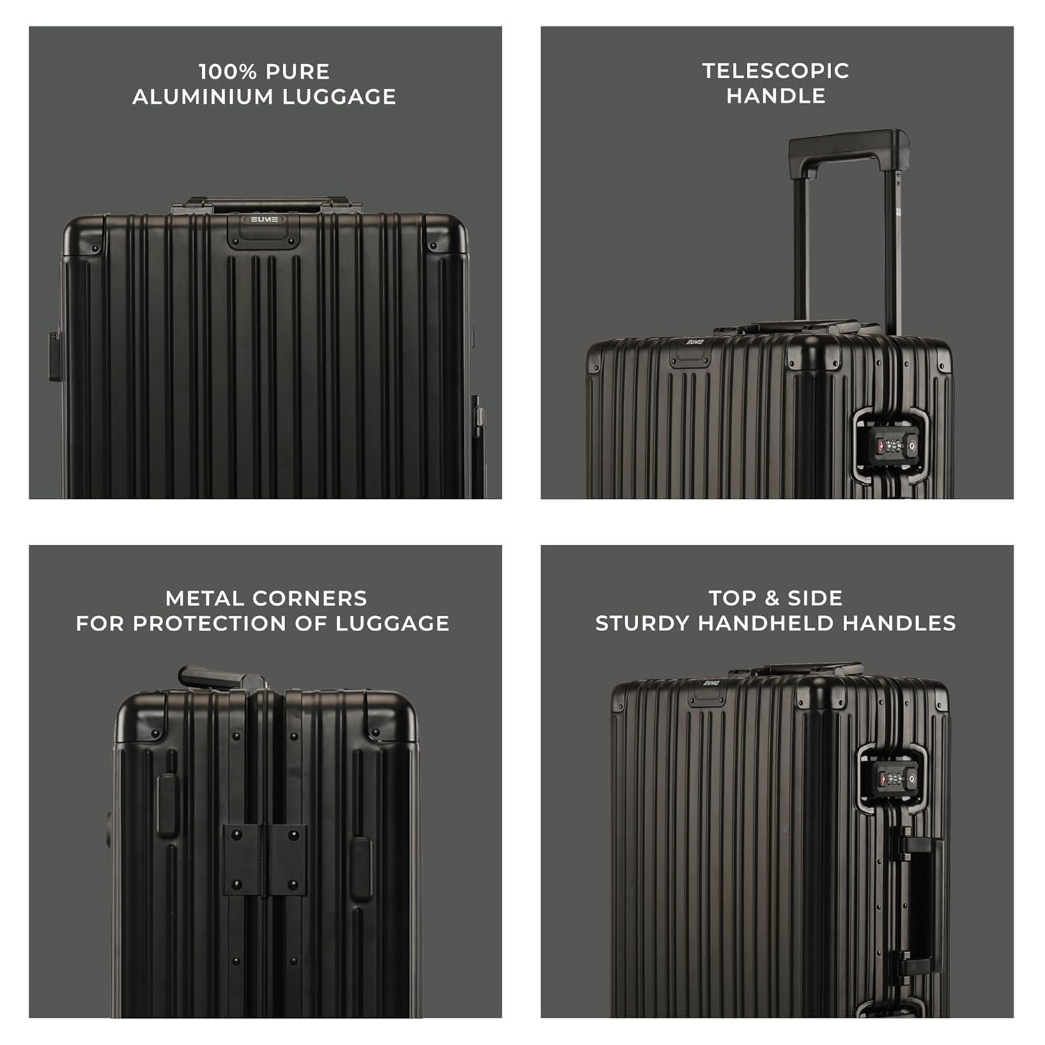 The EUME Aluminium Black 20-inch cabin trolley bags for travel are meticulously crafted from 100% high-end anodized aluminium for durability and a stylish look. Equipped with 8 SilentRun 360-degree double wheels and a high-end steering system, our cabin trolley bags ensure sturdy and effortless movement. Discover the timeless elegance of Our Luggage Trolley, designed for longevity and perfect for short trips, fitting comfortably in most airline overhead compartments.