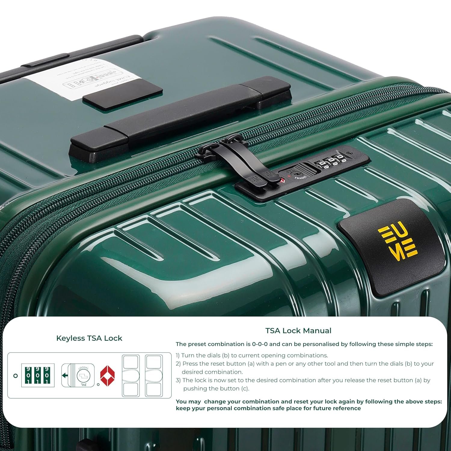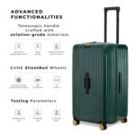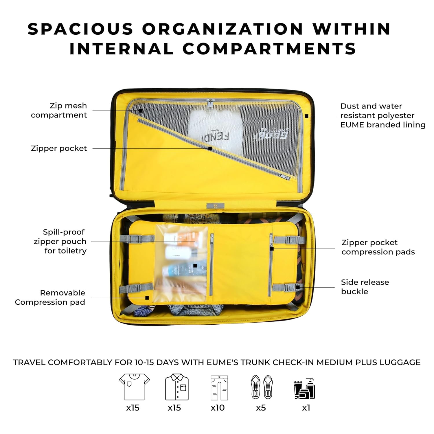 The EUME Trunk Check-in Plus 26-inch trolley bag large size is meticulously crafted from 100% German Bayer Polycarbonate (PC), known for its durability and lightweight construction. These trolley bag medium size is equipped with smooth EUME SilentRun 360-degree double wheels for stable steering, facilitated by ball-bearing mounted wheels with cushioned axles and TSA-approved locks, these travel bags for luggage trolley offers secure and effortless travel, ideal for airline baggage inspections.