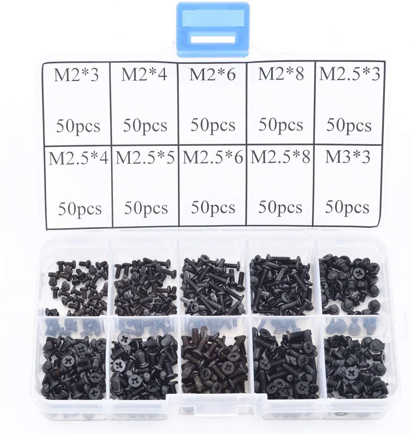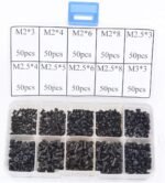 Perfect for laptop computer screw.Easy find it with label.Popular Size as, M2x3 60pcs, M2x4 50pcs, M2x6 50pcs, M2x8 50pcs, M2.5×3 50pcs, M2.5×4 50pcs, M2.5×5 50pcs,M2.5×6 50pcs, M2.5×8 50pcs, M3x3 50pcs, Package Includes: 500 Pcs Laptop Screws Set with plastic box Compatible with all universal laptop.