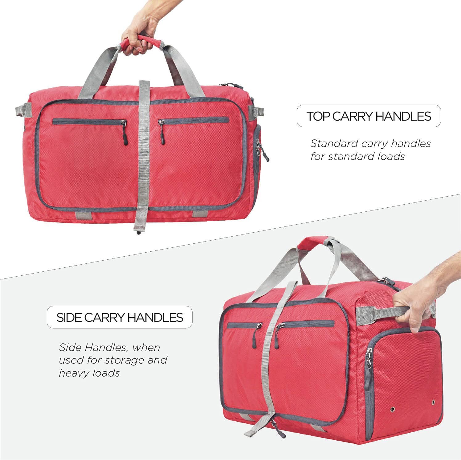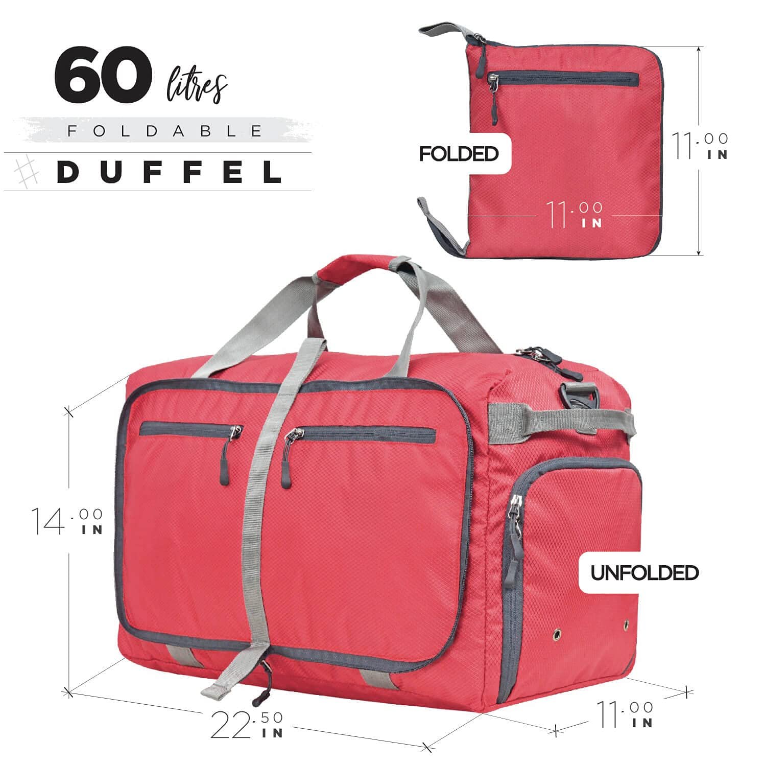 FOLDABLE AND SPACIOUS: Capacity 60L. Unfolded Size: 22.5x14x11 inch, Folded Pouch Size: 11×11 inch