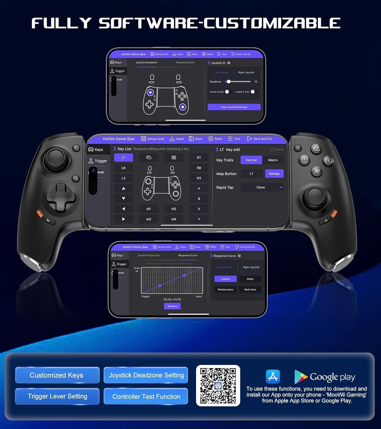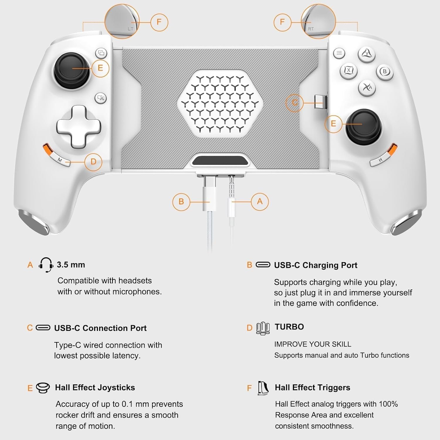 Hall-Rocker & Hall-Trigger: mobile controller Hall Effect sensing sticks high precision, fast response, provide the precision and durability that mobile gamers demand; And the Hall Effect analog triggers offer unparalleled smoothness and responsiveness, giving you a competitive advantage in any game; Press and hold the H + LT/RT button for 2sec to switch to linear trigger mode