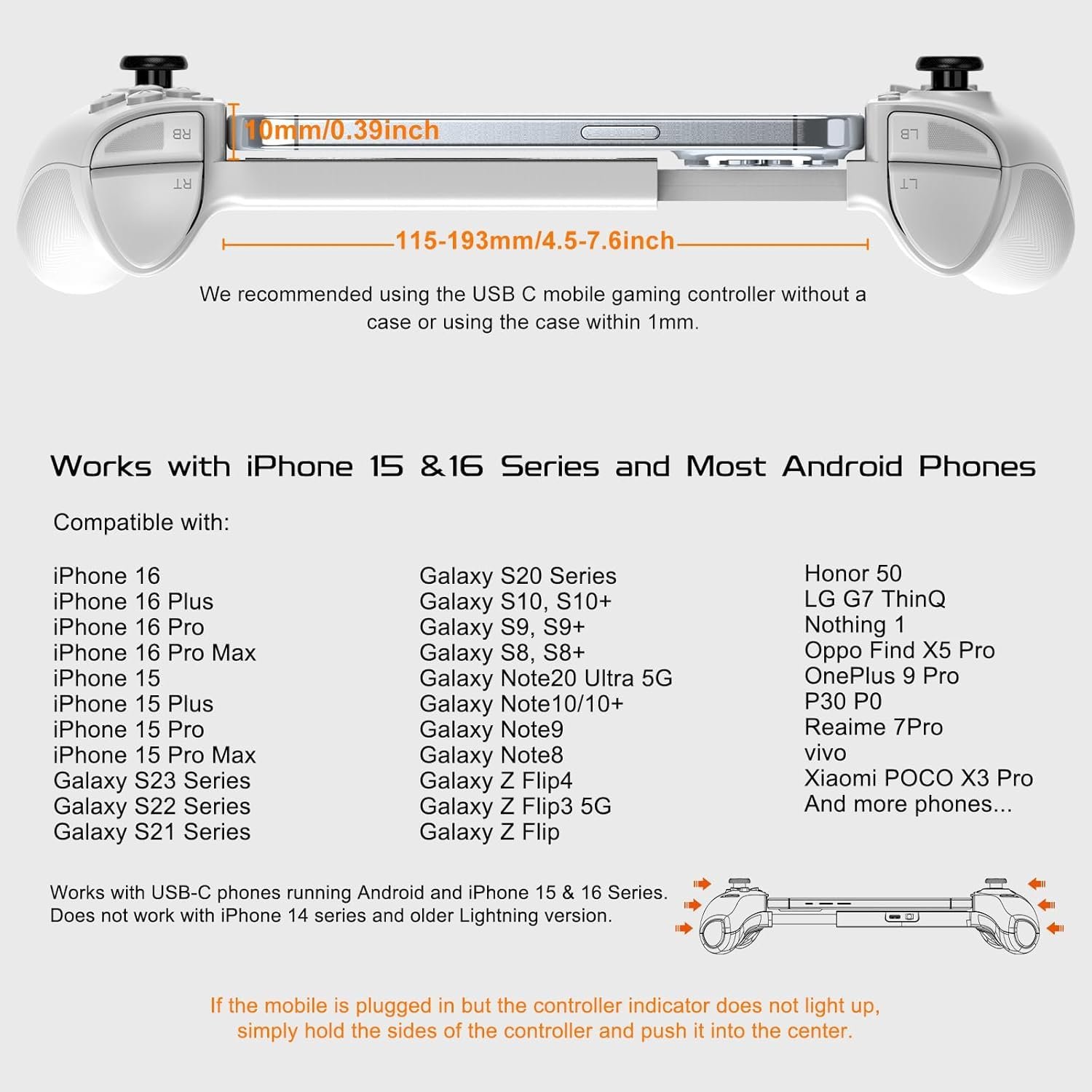 Mobile Controller Compatibility: The phone controller for Android type c, compatible with Galaxy S24/Galaxy S24+/Galaxy S24 Ultra/Galaxy S23/Galaxy S23+/Galaxy S23 Ultra/Galaxy S22, and more Galaxy S series; Mobile phone controller compatible with iPhone 16/16 Plus/16 Pro/16 Pro Max/iPhone 15/15 Plus/15 Pro/15 Pro Max