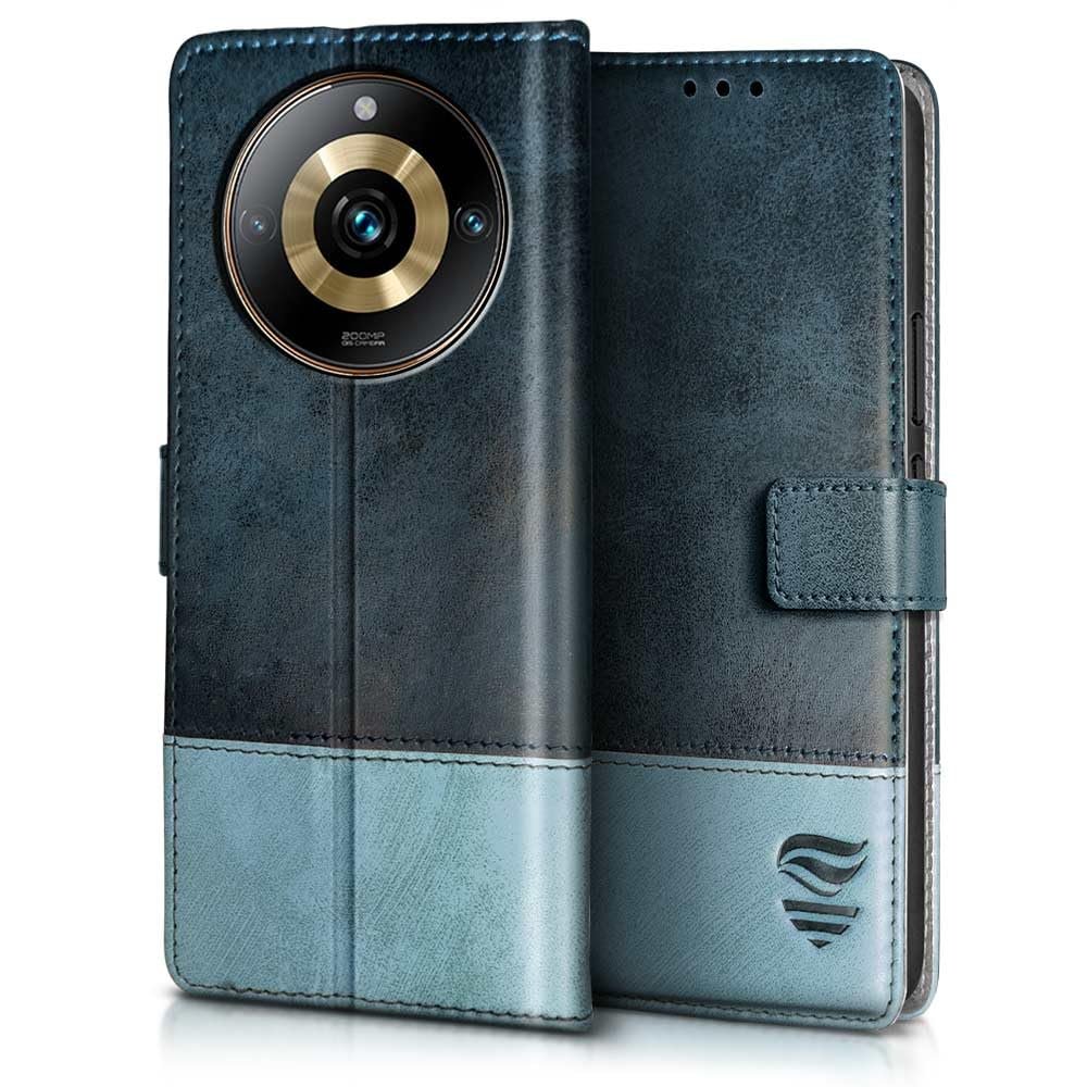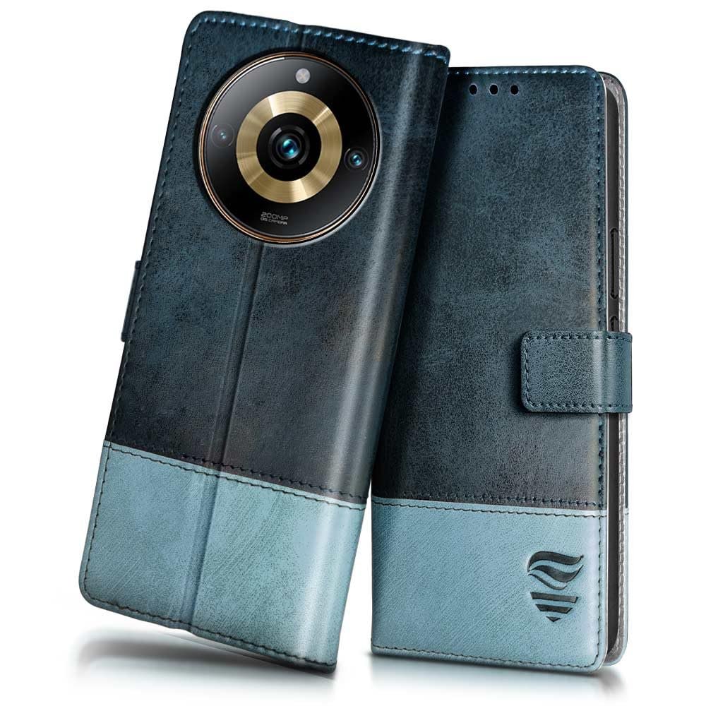 FLIPPED Vegan Leather Flip Case Back Cover for Realme Narzo 60 PRO | 11 PRO | 11 PRO PLUS 5G (Flexible, Shock Proof | Hand Stitched Leather Finish | Card Pockets Wallet & Stand | Blue with Aquamarine)