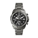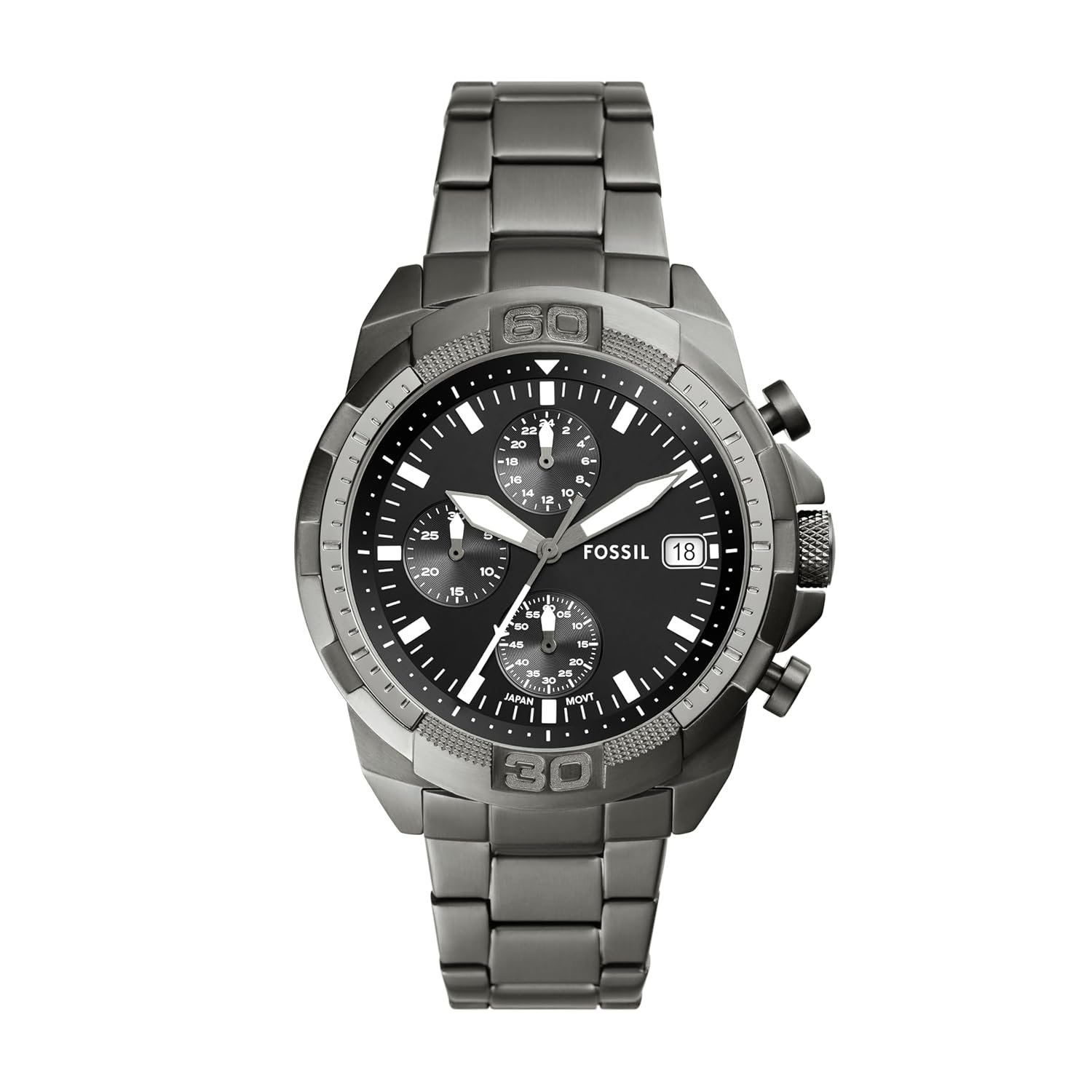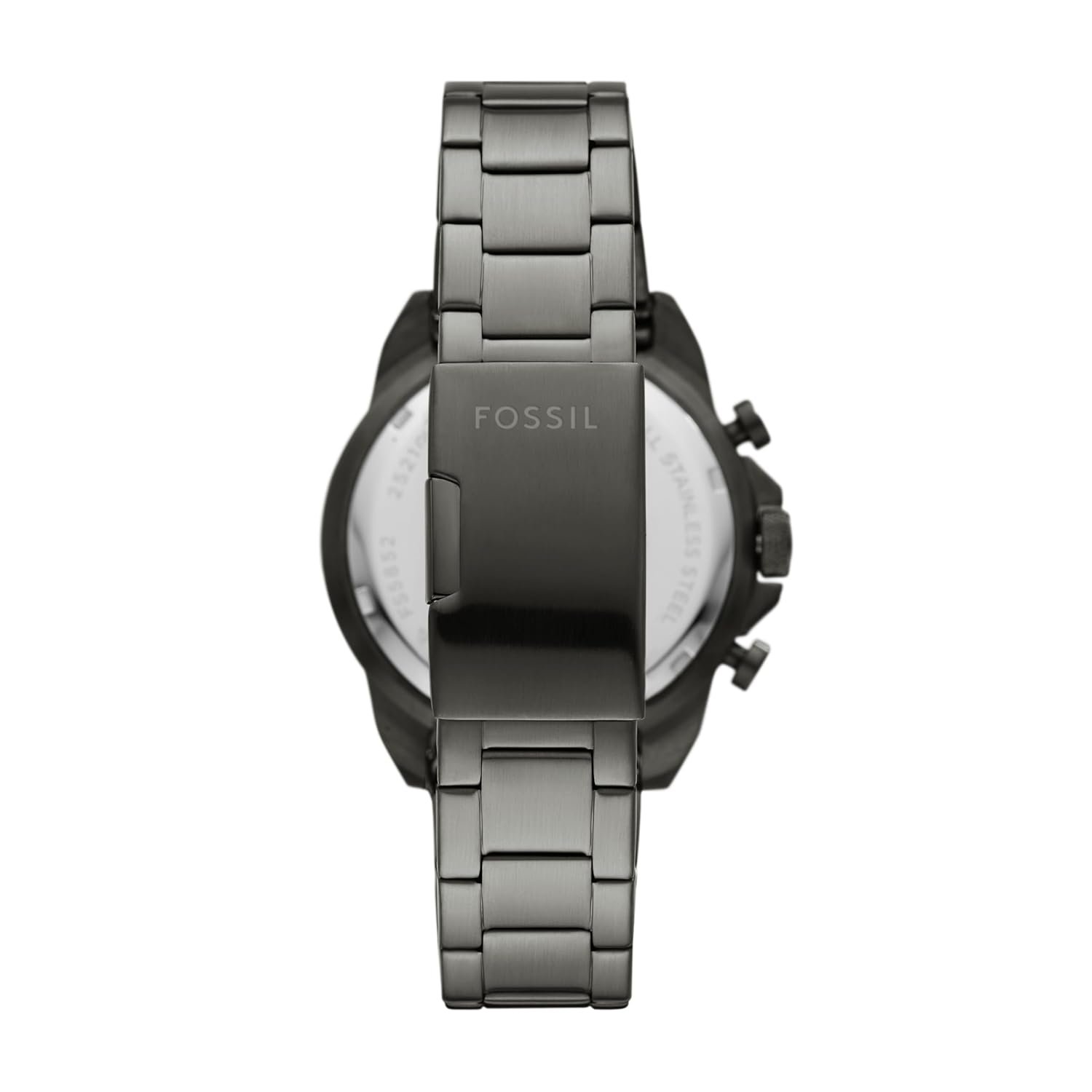 Smoke plated stainless steel bracelet with fold-over clasp closure; interchangeable with Fossil 22mm watch straps