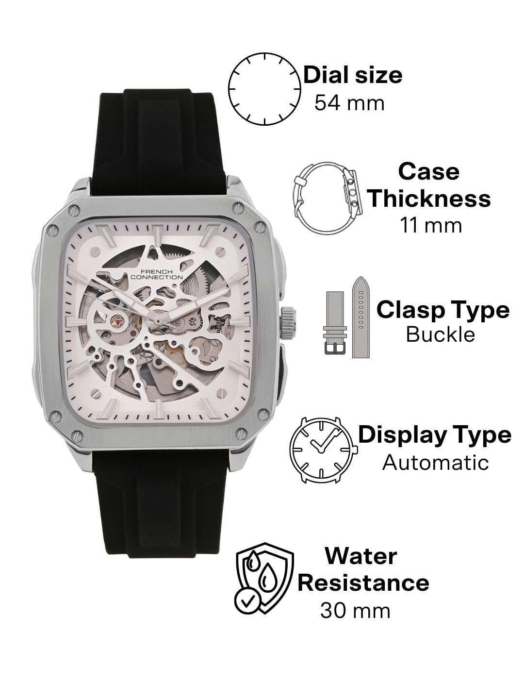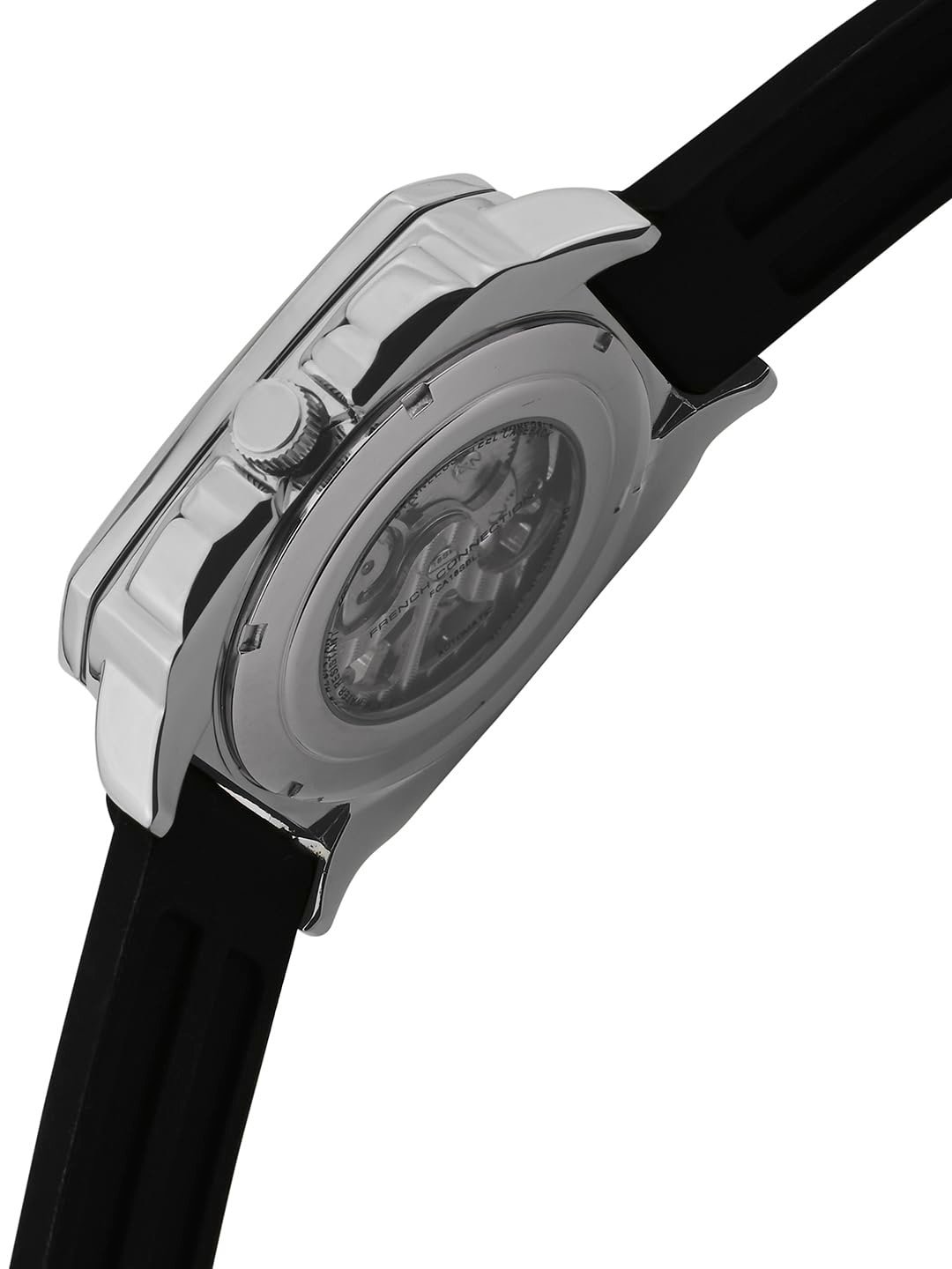 Experience elegance and precision with the French Connection See Through Silver Dial With Black Silicone Strap Automatic Watch – For Mens FCA18SBL. Designed to stand out, this timepiece combines modern aesthetics with reliable performance, making it the perfect accessory for any occasion. – Stylish design featuring Black Silicone Strap Automatic Watch – For Mens FCA18SBL – Crafted for durability and long-lasting use – Ideal for both casual and formal wear – Precision timekeeping for everyday reliability – Perfect gift for fashion-forward individuals