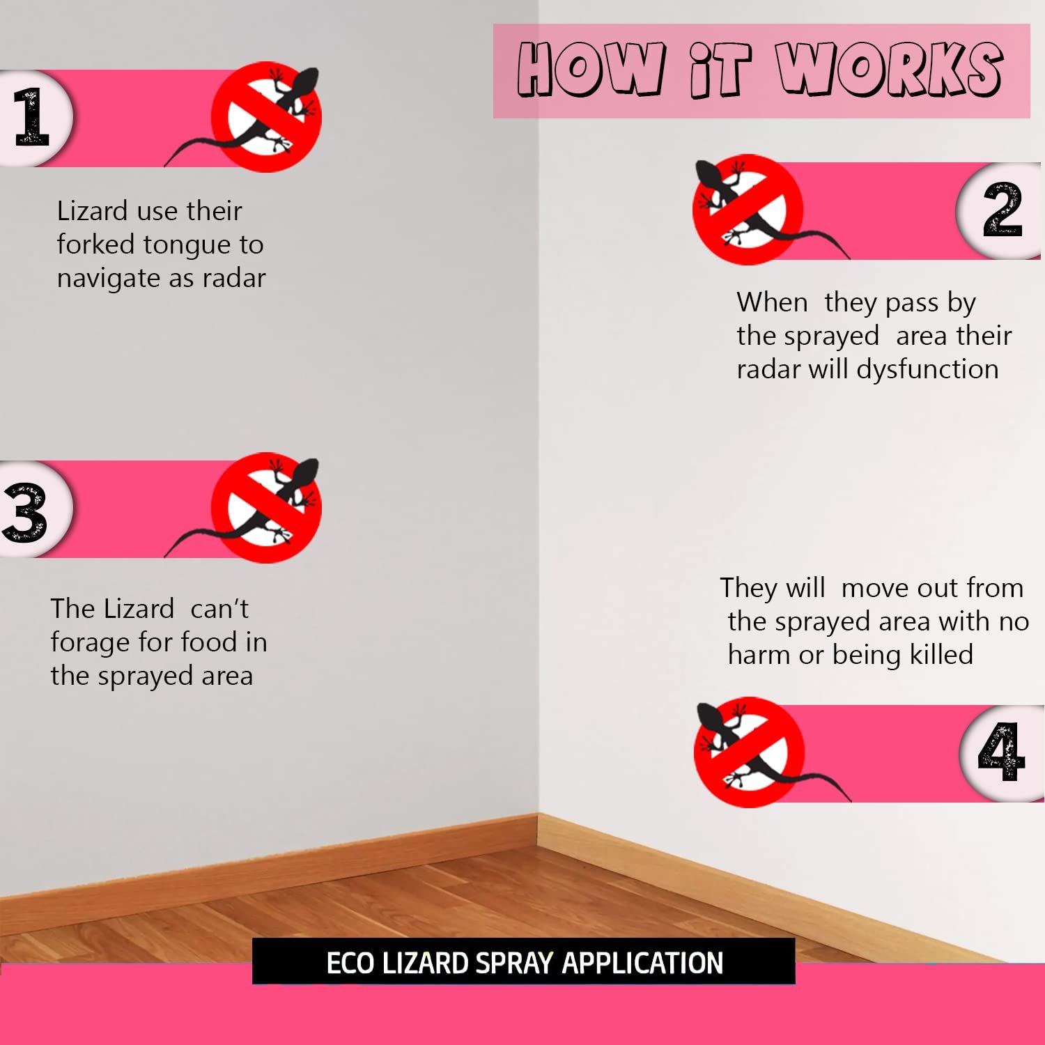 Quick Result : Repeat spraying for about a week to ensure lizard’s not to be seen for about 2 weeks. Thanks to the well-built nozzle, spraying the repellent is easy and leak-free, no matter how frequent the usage. Never worry about unpleasant stains and messes with our potent lizard spray repellent