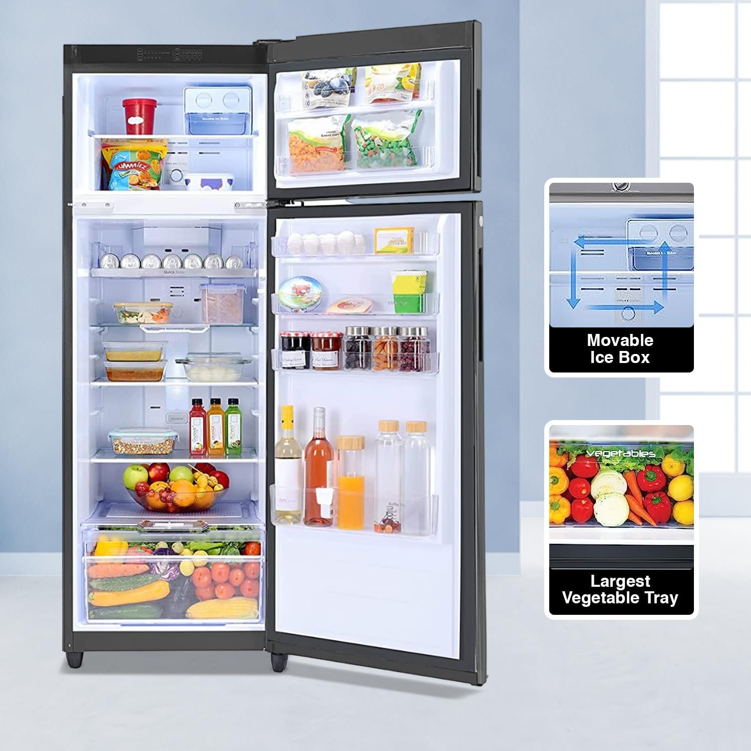 Storage Description : Fresh food capacity : 222 L | Freezer capacity : 50 L | shelves : 3 | Shelf type : Toughened Glass | Vegetable Storage Space : 27 L