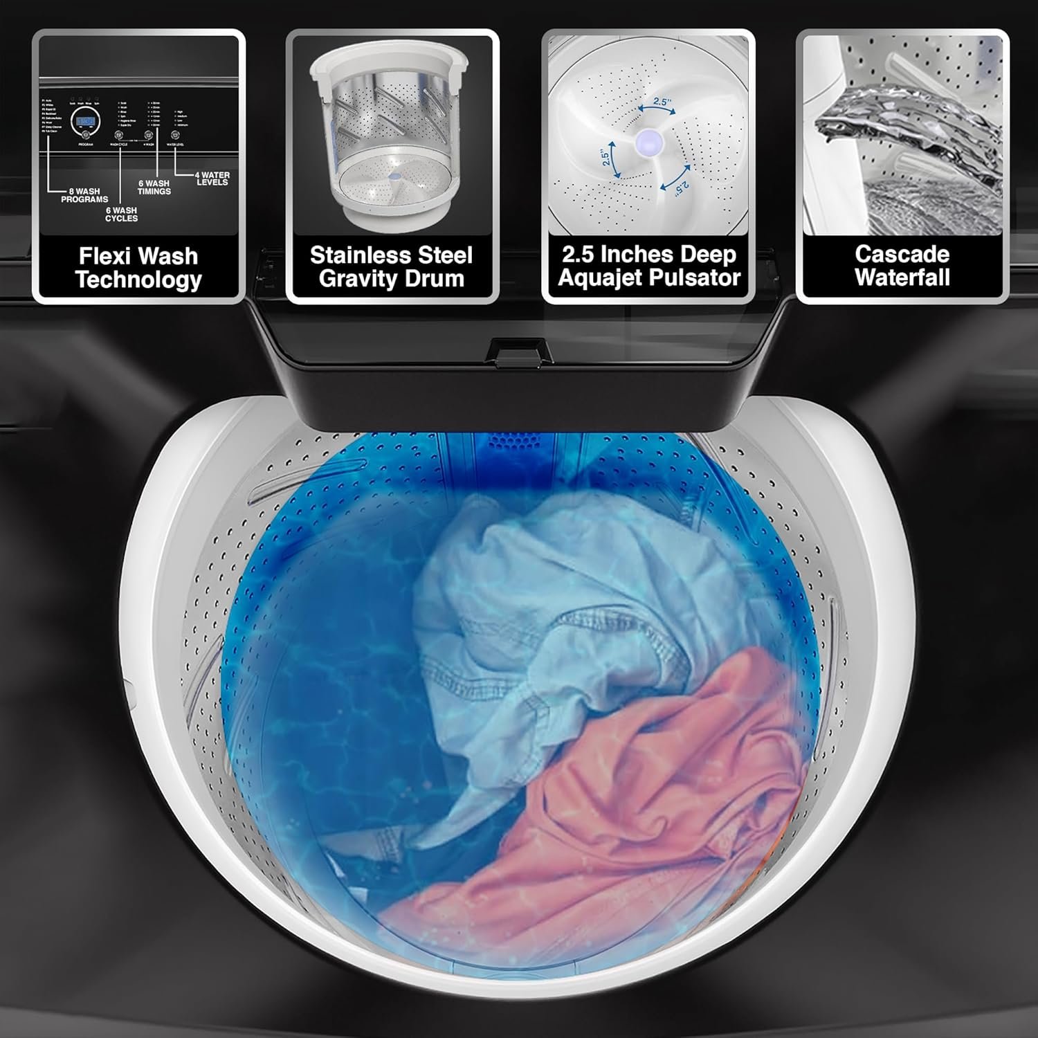 Key Performance Features: Zero pressure technology | Inbuilt soak technology | Cascade waterfall effect | Stainless steel gravity drum | Aquajet pulsator