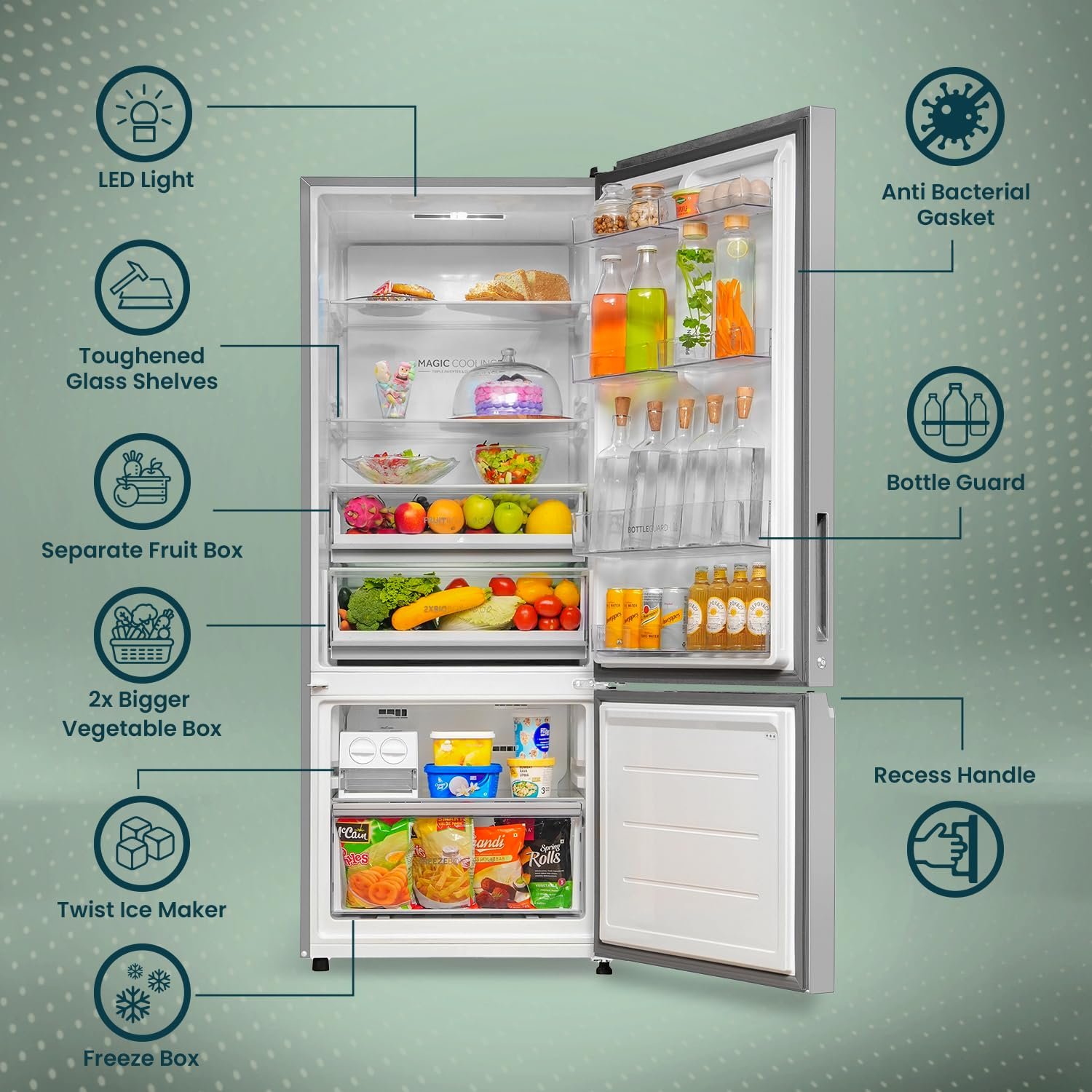 Additional Features : Jhukna Mat – Reduces bending issues by 90% | 2x Bigger Veg box | Separate Fruit Box | 1 Hour Icing Technology | Twist Ice Maker | Toughened Glass Shelves | Anti Bacterial Gasket | LED Light | Clean Back | 10 years warranty on Triple inverter Compressor