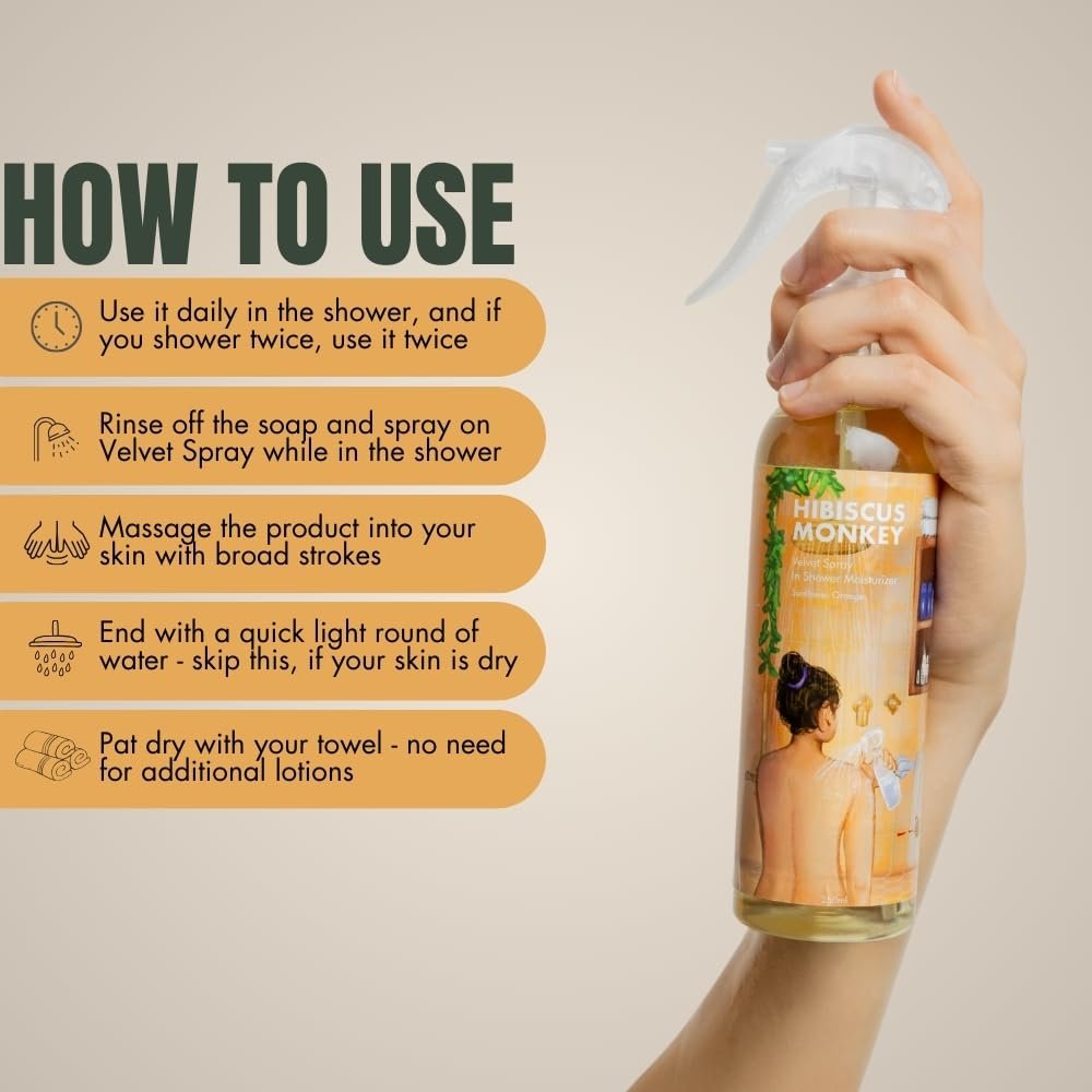 velvet spray, in shower body moisturizer, natural, lotion, cream, oil, hibiscus monkey, HOW TO USEvelvet spray, in shower body moisturizer, natural, lotion, cream, oil, hibiscus monkey, HOW TO USE