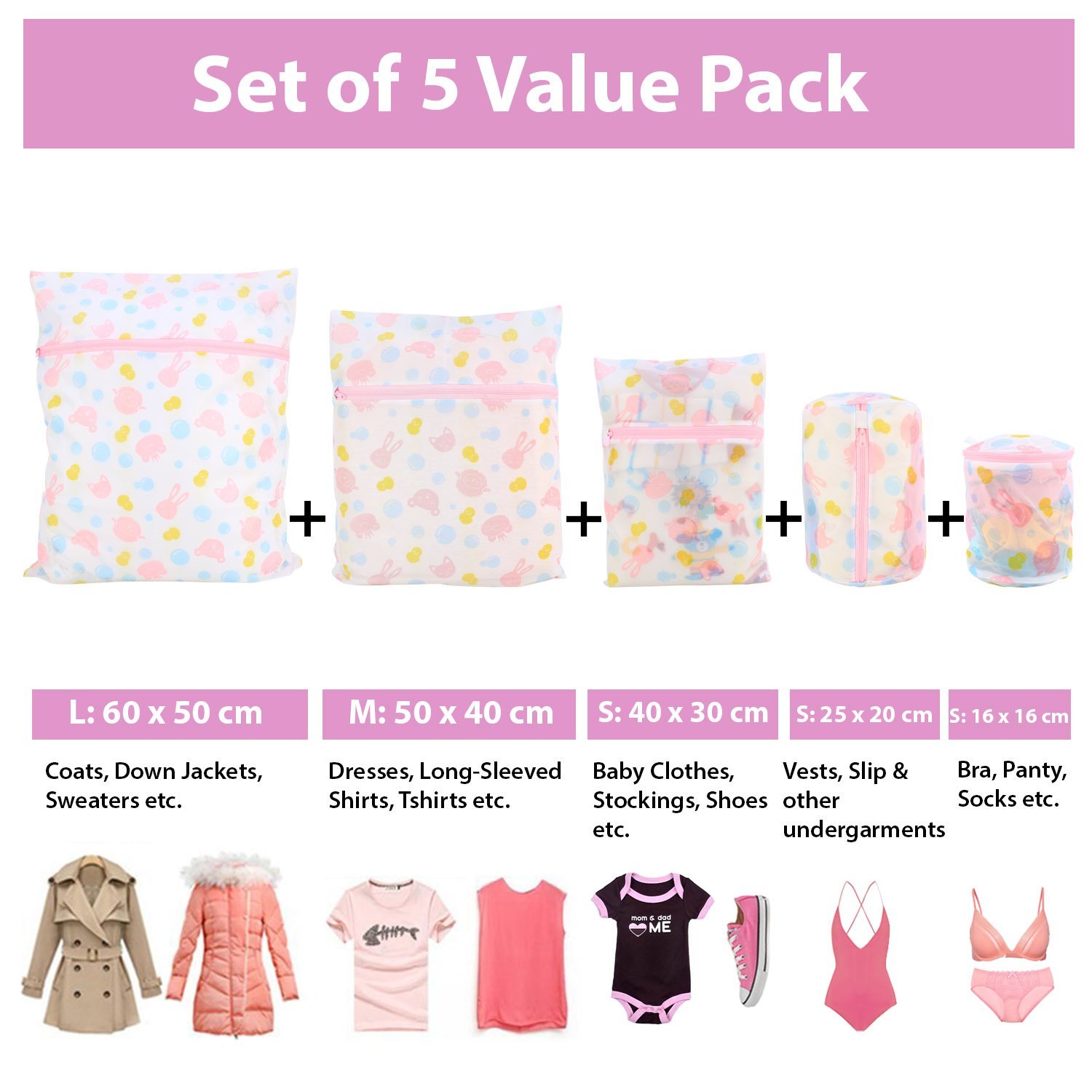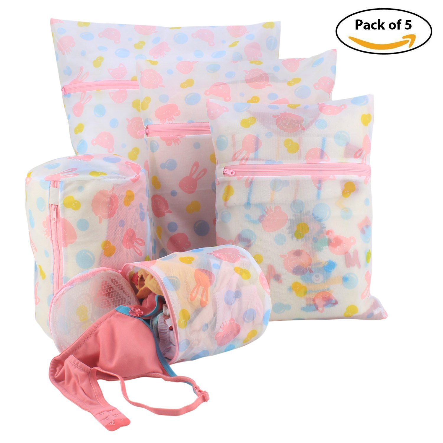5 SIZES: This mesh laundry bag with zipper set has 5 different sizes which is great for sorting dark and light color clothes, can be used for washing Innerwear, Undergarments, lingerie, hosiery, delicates, sock, dress, T-shirt, crochet cardigan panties etc.Size: 1 Large: 60 x 50 cm, 1 Medium – 50 x 40 cm, 1 Small: 40 x 30 cm, 1 Cylinder: 25 x 20 cm, 1 bra wash bag: 16 x 16 cm.