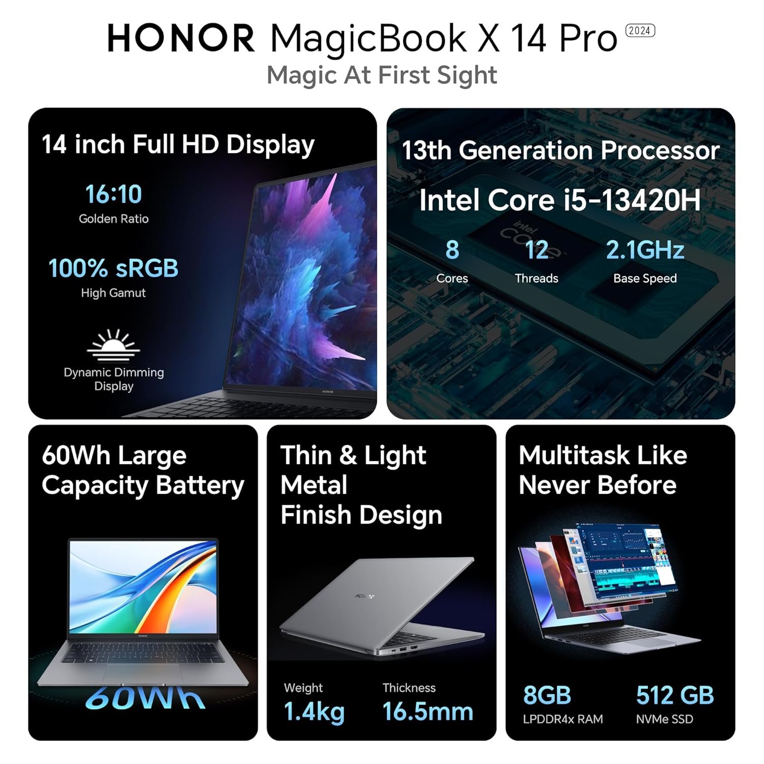 【 Stylish Appearance】Honor Magicbook X14 Pro (2024) has Premium Aluminium Metal Body with 16.5MM Thickness, 4.5 MM Left, Right Narrow Bezels and the weight of the laptop is only 1.4kg, which allows you to carry it easily, making it very convenient for travel and work