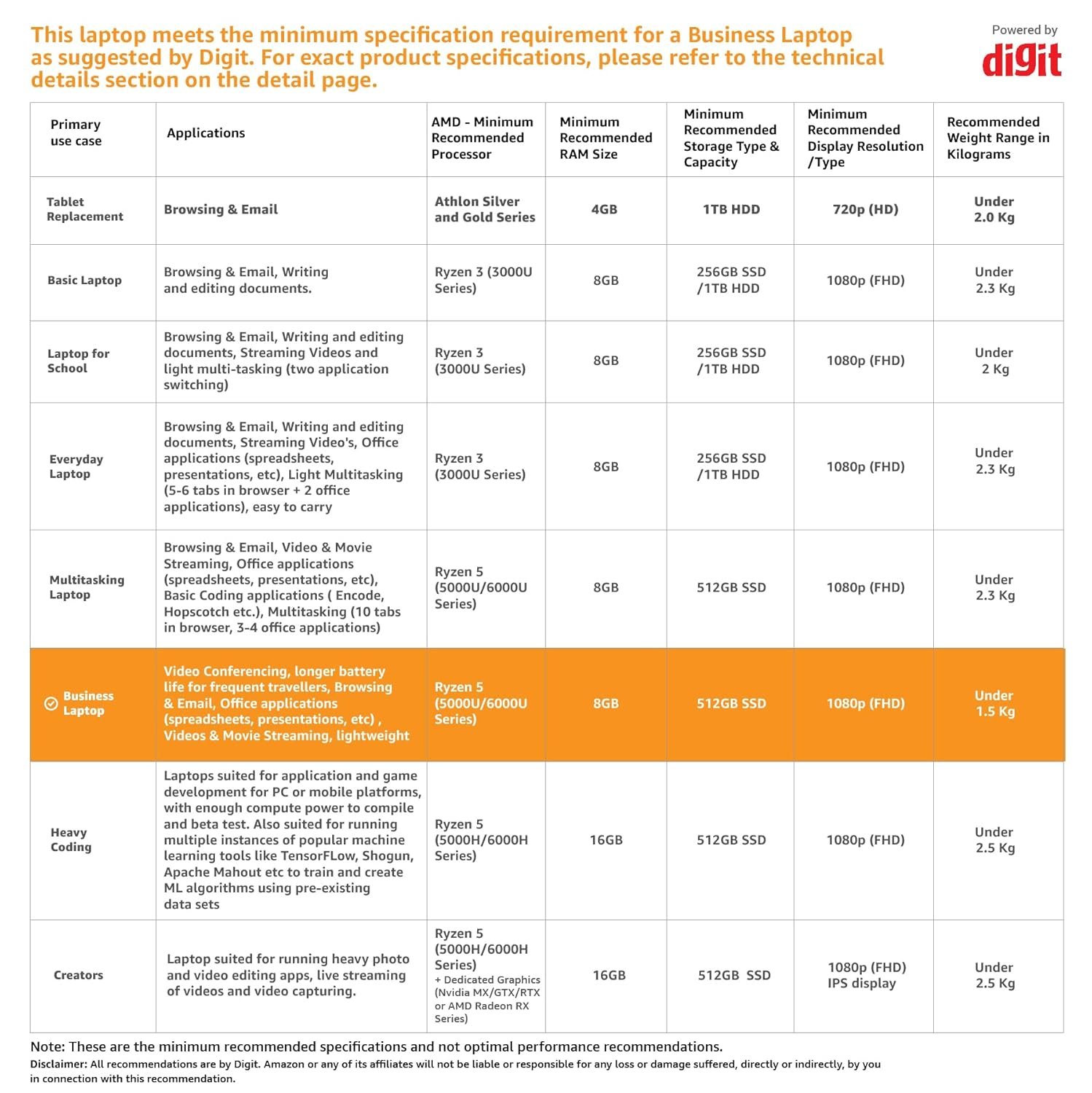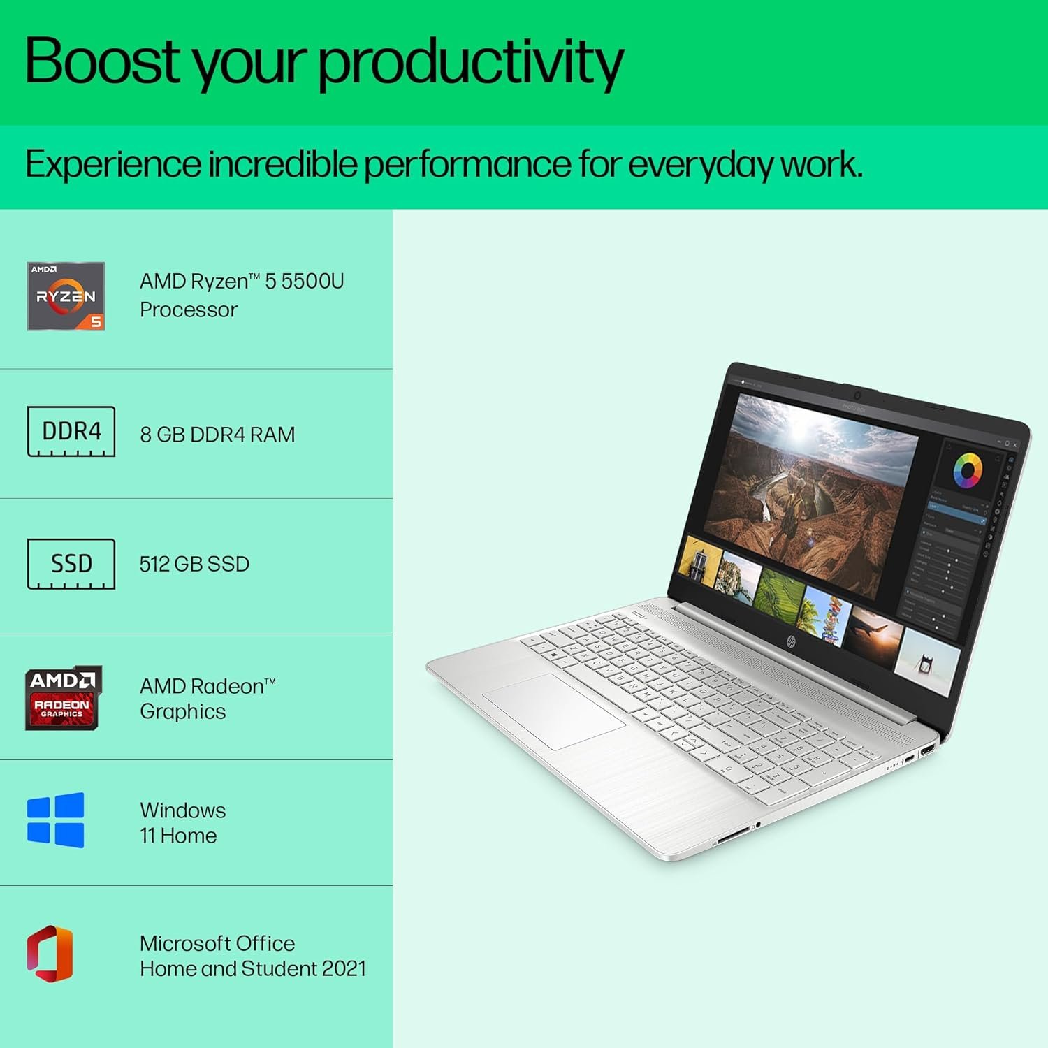 Processor: AMD Ryzen 5 5500U (up to 4.0 GHz max boost clock(2i),8 MB L3 cache, 6 cores, 12 threads)| Memory & Storage: 8GB (1x8GB) DDR4 3200,Upto 16 GB DDR4-3200 SDRAM (2 x 8 GB)| Storage: 512 GB PCIe NVMe M.2 SSD