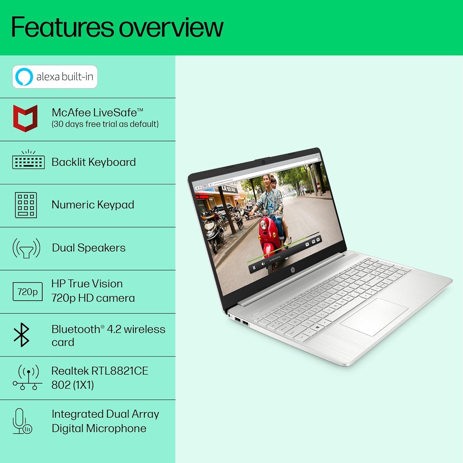 Features: Camera: HP True Vision 720p HD camera with integrated dual array digital microphones| Audio: Dual Speakers| Keyboard: Full-size, backlit, natural silver keyboard | Alexa Built In | Battery: 3-cell, 41 Wh Li-ion, Support battery fast charge| Networking: Realtek RTL8821CE-M 802.11a/b/g/n/ac (1×1) Wi-Fi and Bluetooth 4.2 combo,MU-MIMO supported, Miracast compatible