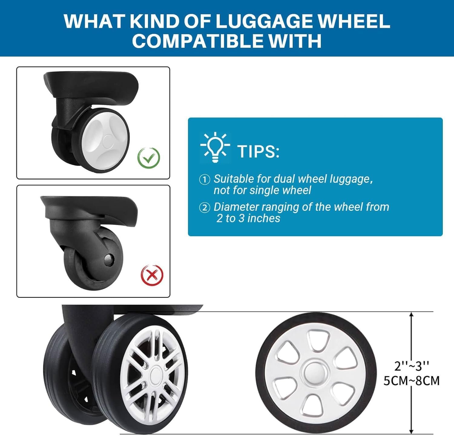 The dimensions of wheel covers is 2.2 x 2.2 x 0.6in, a total of 8pcs, which conforms to most luggage tires, but it is necessary to note that it is not compatible with too small or too large tires, please confirm the number and size of tires before you purchase.