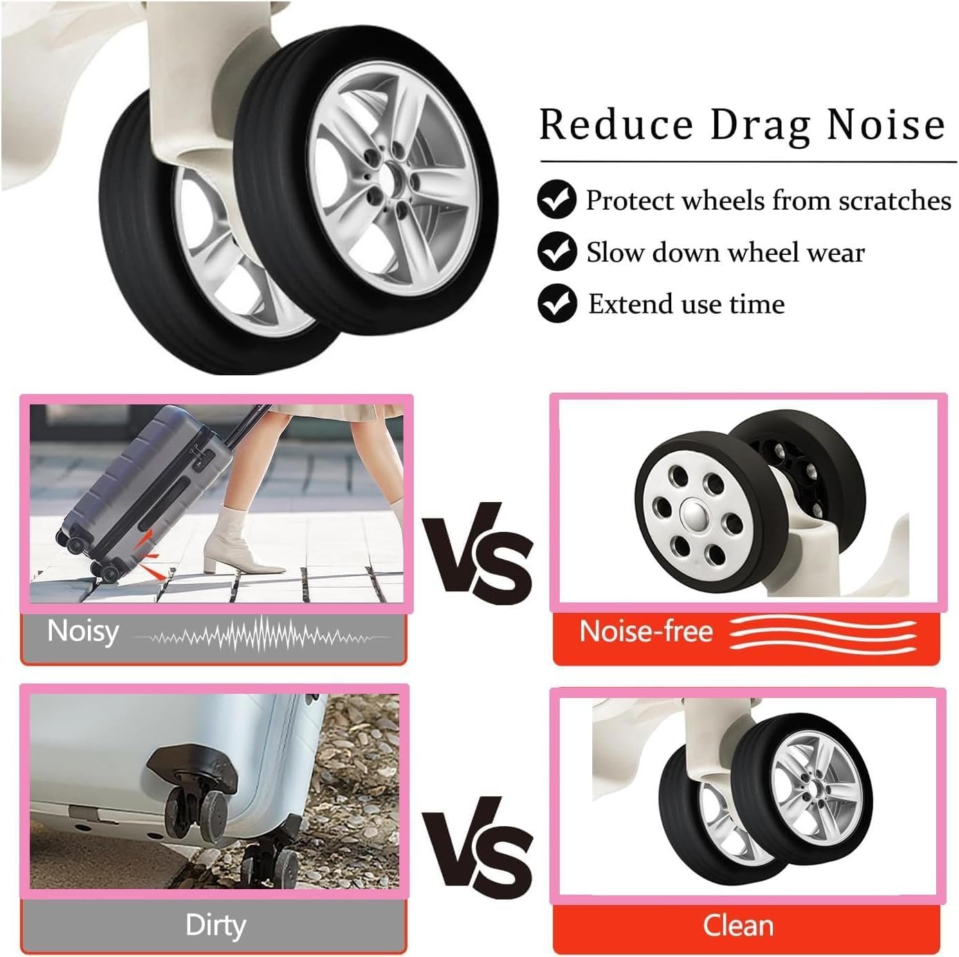Our luggage wheels protectors are made of silicone to avoid scratches and scuffs from sharp objects. No matter where you go, you don’t have to worry about the wheels, let your wheels look new forever. The installation of luggage wheel silicone protector is simple, you only need to take out the suitcase and put the cover on the wheel, and you can change one in a few seconds. Luggage wheel cover is designed to shield the wheels of travel bag from scratches, dirt, scuffs, and the perils of sharp objects. By minimizing friction and dampening vibrations, it ensures your suitcase wheels endure the rigors of travel without damage.
