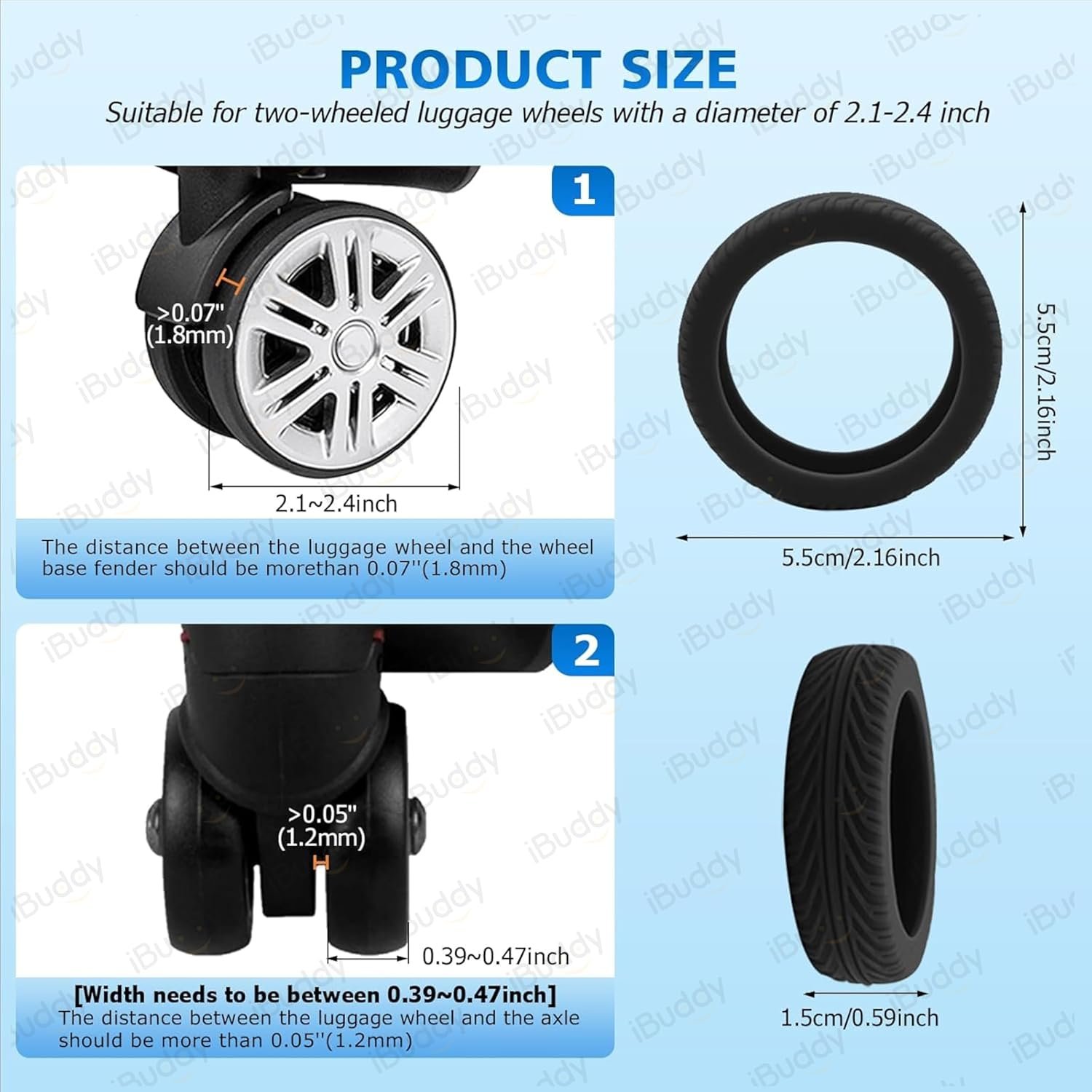 Our silicone luggage wheel covers are tailored for most 8-spinner wheel suitcase sets. Before purchasing, please ensure your suitcase features double wheels with sizes ranging from 2 to 3 inches. Verify that the distance between the wheels, axles, and fenders aligns with the dimensions depicted in our main images above.