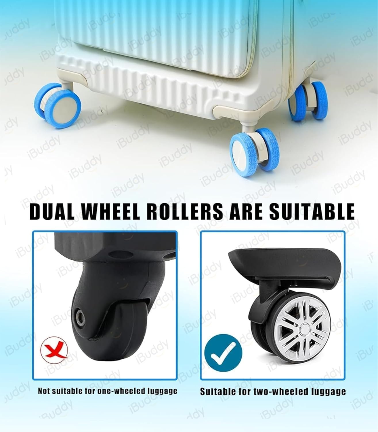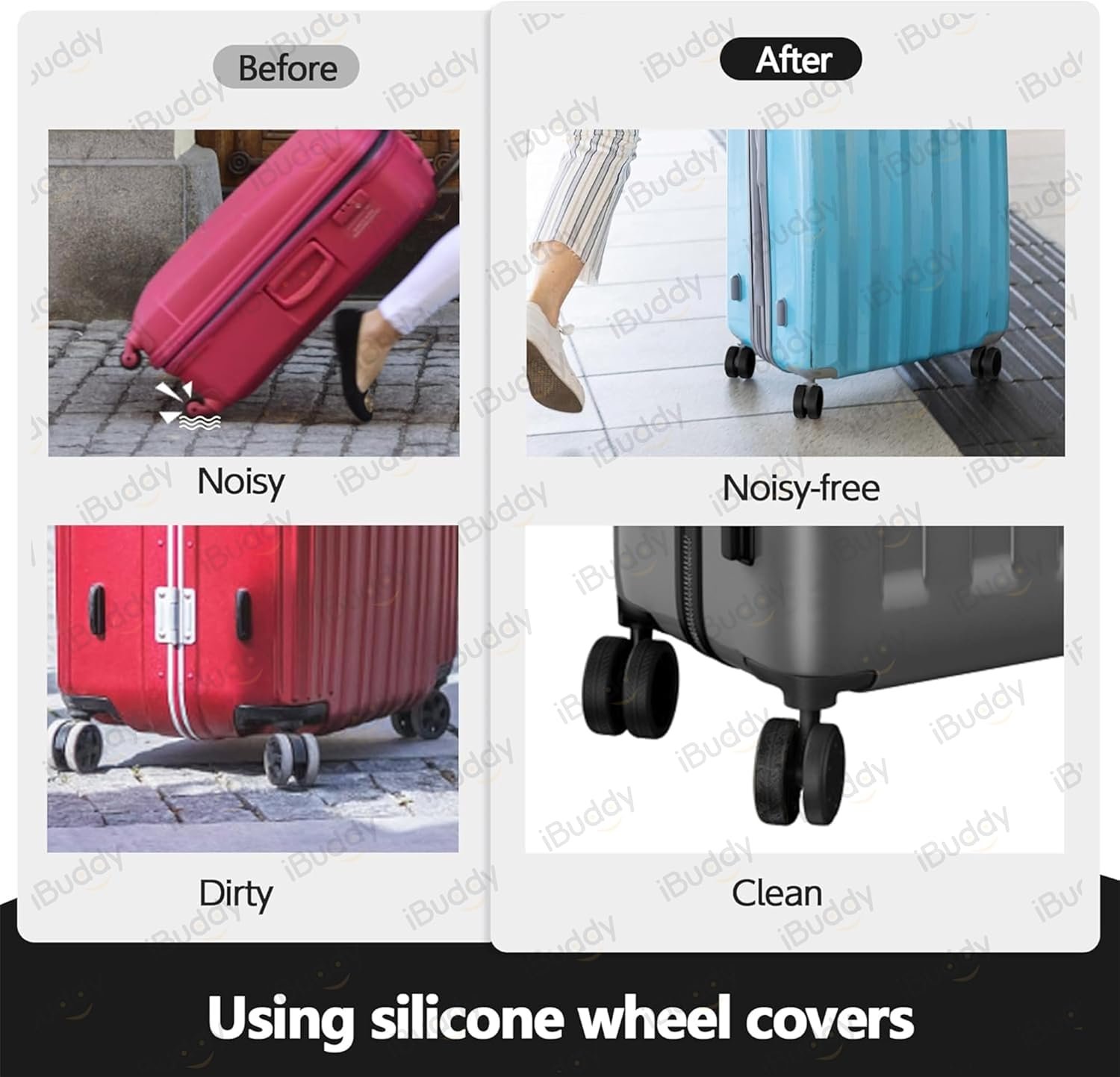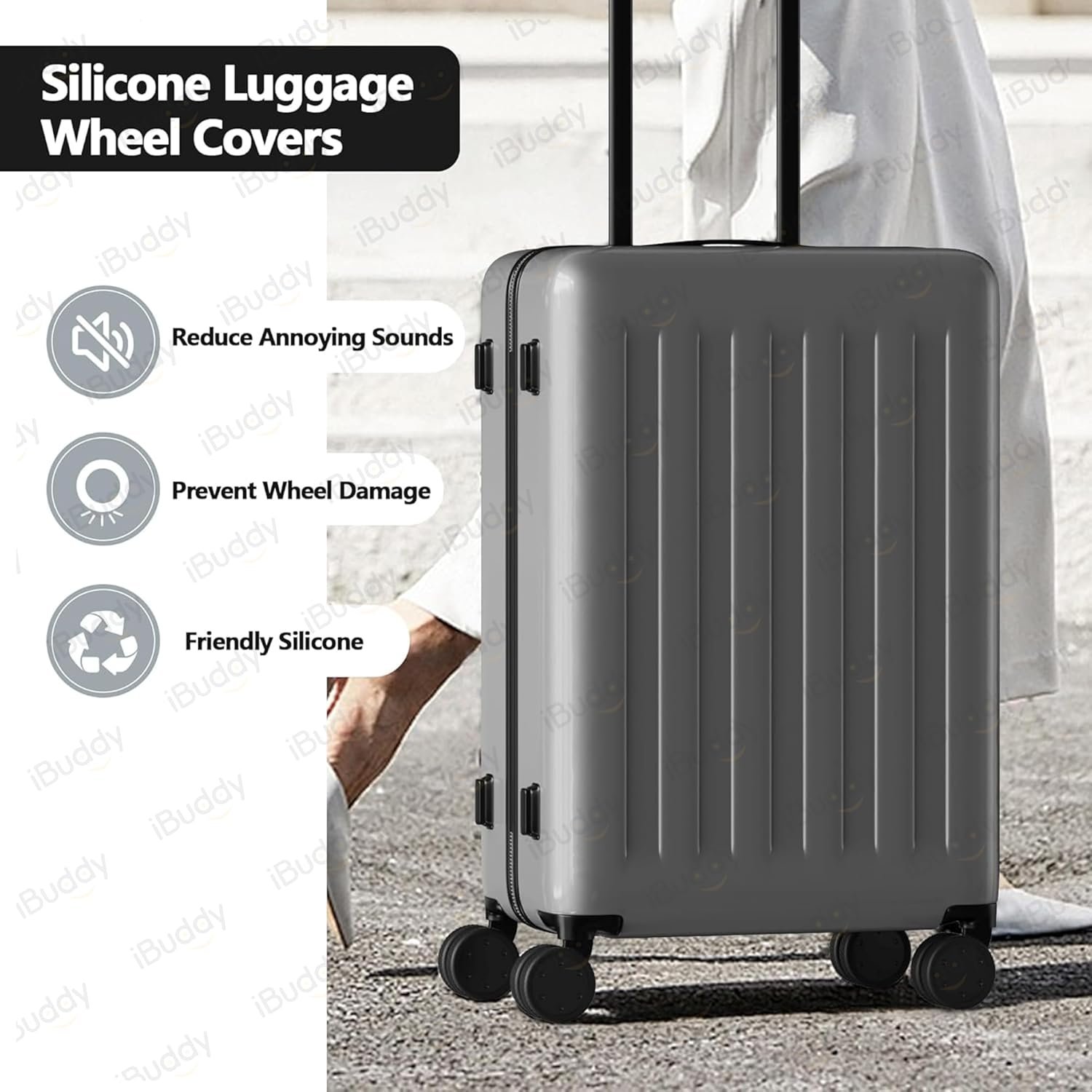 iBuddy Luggage wheel cover is designed to shield the wheels of travel bag from scratches, dirt, scuffs, and the perils of sharp objects. By minimizing friction and dampening vibrations, it ensures your suitcase wheels endure the rigors of travel without damage. Travel bag wheel cover not only preserves the pristine condition of your luggage but also extends its lifespan, saving you from unexpected replacement costs.