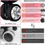 Our trolley wheel covers showcase exceptional craftsmanship, offering enhanced functionality and longevity. Upgraded with increased thickness, they ensure a perfect, snug fit for your wheels. These non-sticky suitcase wheel cover are effortless to install and remove, allowing for multiple uses with ease. Cleaning is straightforward too, requiring only water to keep them looking fresh.