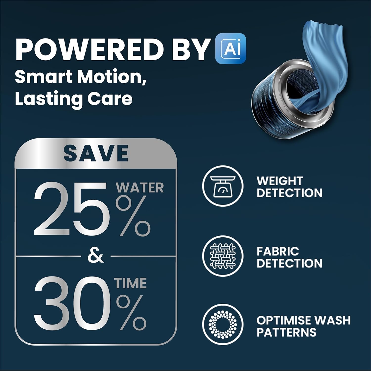 Powered By AI : A Neural Network-Based Algorithm Detects Fabric Type And Weight. It Then Optimises The Wash—Duration, Water Level, Wash Actions And The Level of Gentleness Needed.