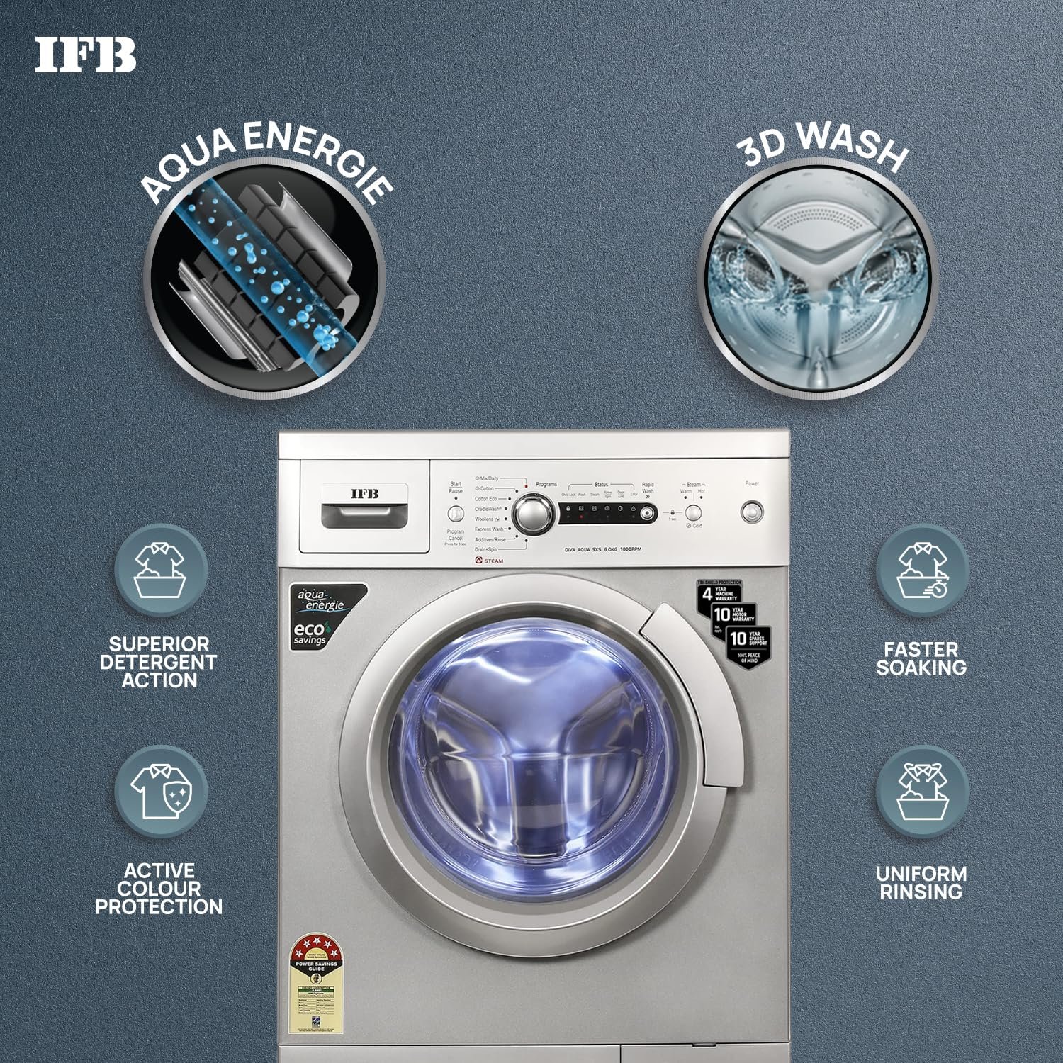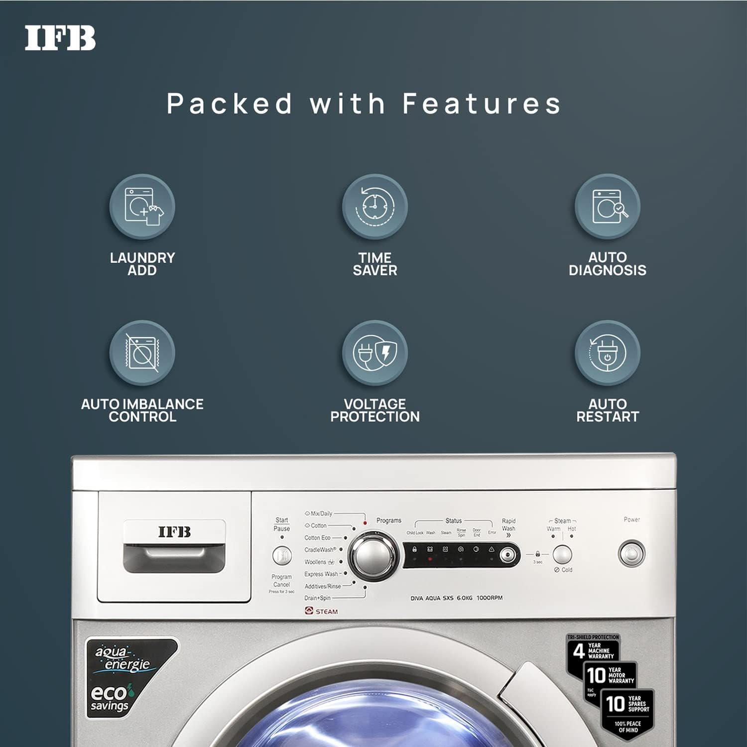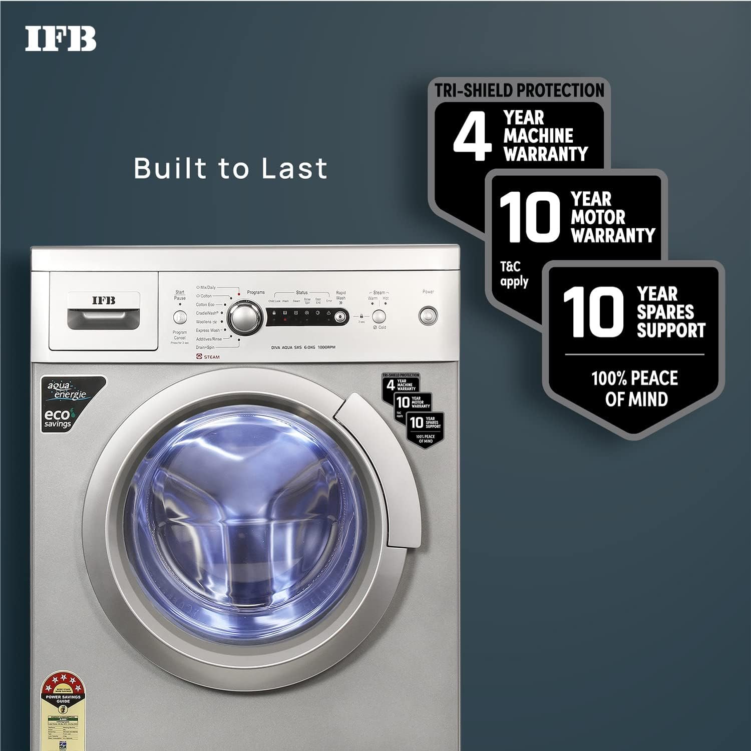 TRISHIELD PROTECTION : IFB washers come with India’s best warranty 4 years machine warranty + 10 years Motor Warranty + 10 years Spares Support