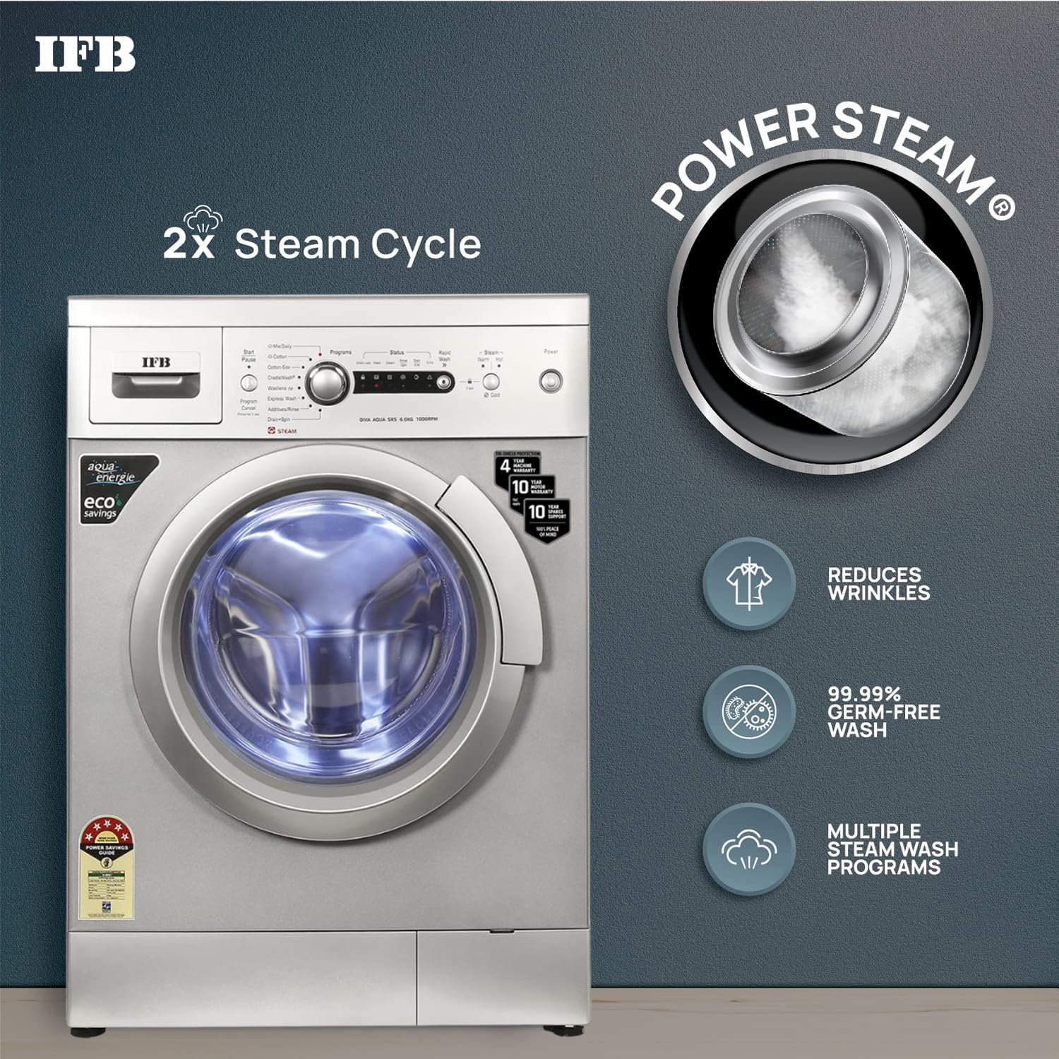Key Features: 2X Power Steam Cycle for Power Cleaning, Aqua Energie Device for Water Softening, Better Detergent Action & Color Protection, Cradle Wash for Delicates, Time Saver: Saves Water, Power, Detergent & Time, Laundry Add, Quick Express Wash