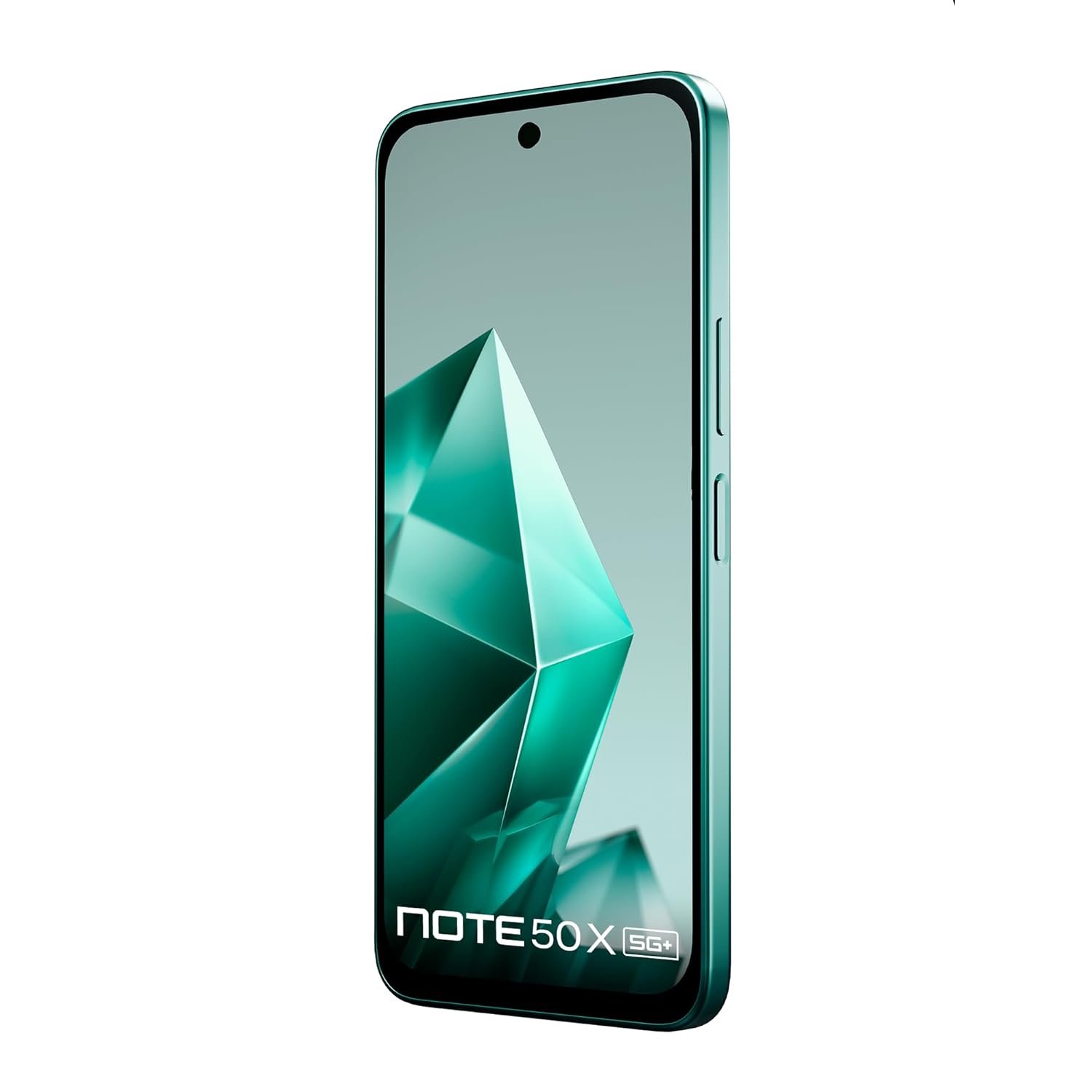 The NOTE 50x 5G+ boasts a premium vegan leather finish with a gem-cut camera module and is powered by the MediaTek Dimensity 7300 ULTIMATE processor, all wrapped in a MIL-810H military-grade certified build. It features a 6.67-inch HD+ IPS LCD display with a smooth 120Hz refresh rate, 672 nits peak brightness, and up to 240Hz touch sampling rate, supporting wet and greasy touch. Certified by TÜV Rheinland for low blue light, it ensures safe and immersive viewing. The camera setup includes a 50MP dual rear camera with 4K video recording, 10X digital zoom, dual flash, AIGC Portrait Mode, and 12+ photography modes, along with an 8MP front camera with flash. Backed by 8GB RAM (expandable up to 16GB with virtual RAM) and 128GB storage, it also features Active Halo Lighting, XOS 15 based on Android 15, and Infinix AI. A 5500mAh SolidCore battery with 45W fast charging, side fingerprint sensor, and dual speakers with Hi-Res Audio round out this feature-rich smartphone.