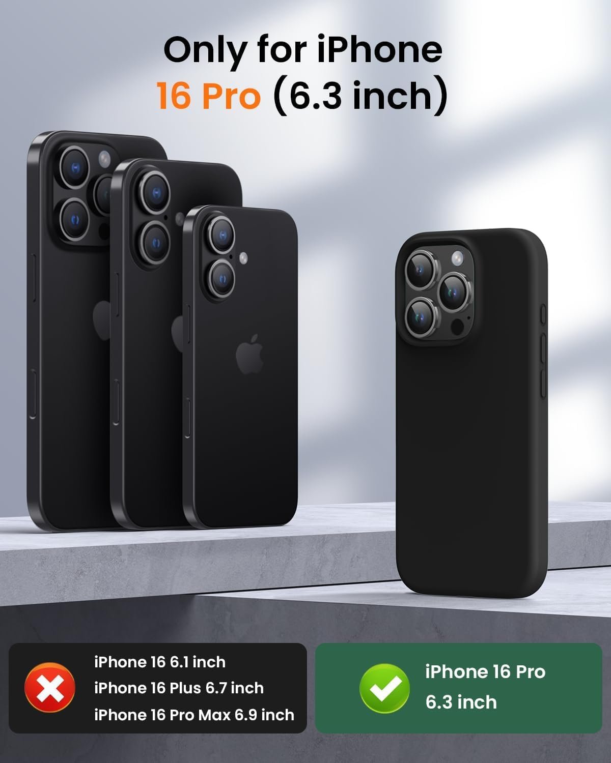 Compatibility: Specifically designed for Iphone 16 pro. Available in multiple color options. Supports wireless chargingFull-Body Protection: Features 1.2mm raised edges around the camera and screen to safeguard against bumps and impacts—offering comprehensive 360° protection.Secure Grip & Easy Maintenance: Made with premium liquid silicone for a sleek yet non-slip grip. The back cover is easy to clean with a damp cloth or tissue.Enhanced Durability: Constructed with upgraded 2.0mm thick liquid silicone (compared to standard 1.5mm). Smooth surface resists fingerprints, scratches, and provides reliable drop protection