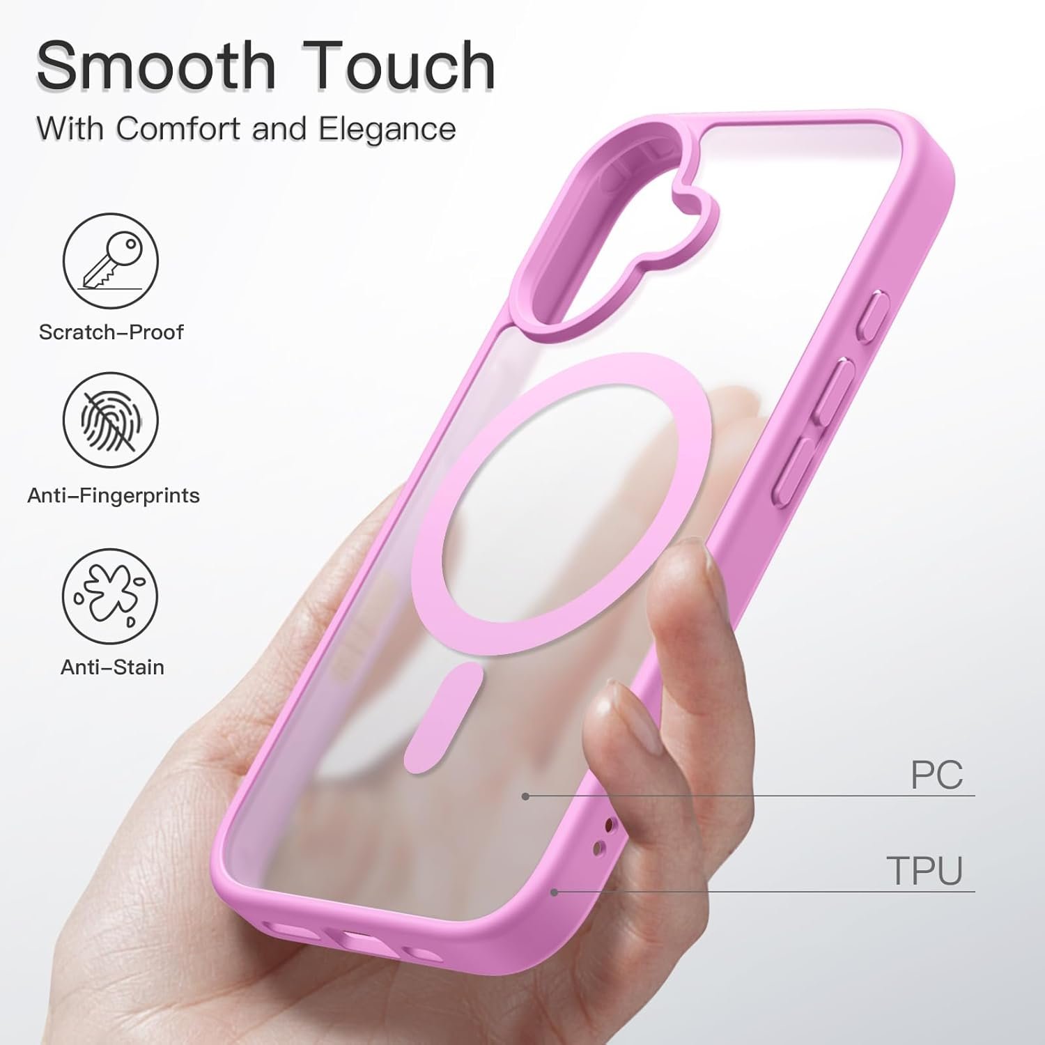 [Translucent Matte Back] The case back is coated with frosted material, comfortable in hand and resisting annoying smudges like fingerprints, oil residue. Also you can still admire the delicate logo of your device