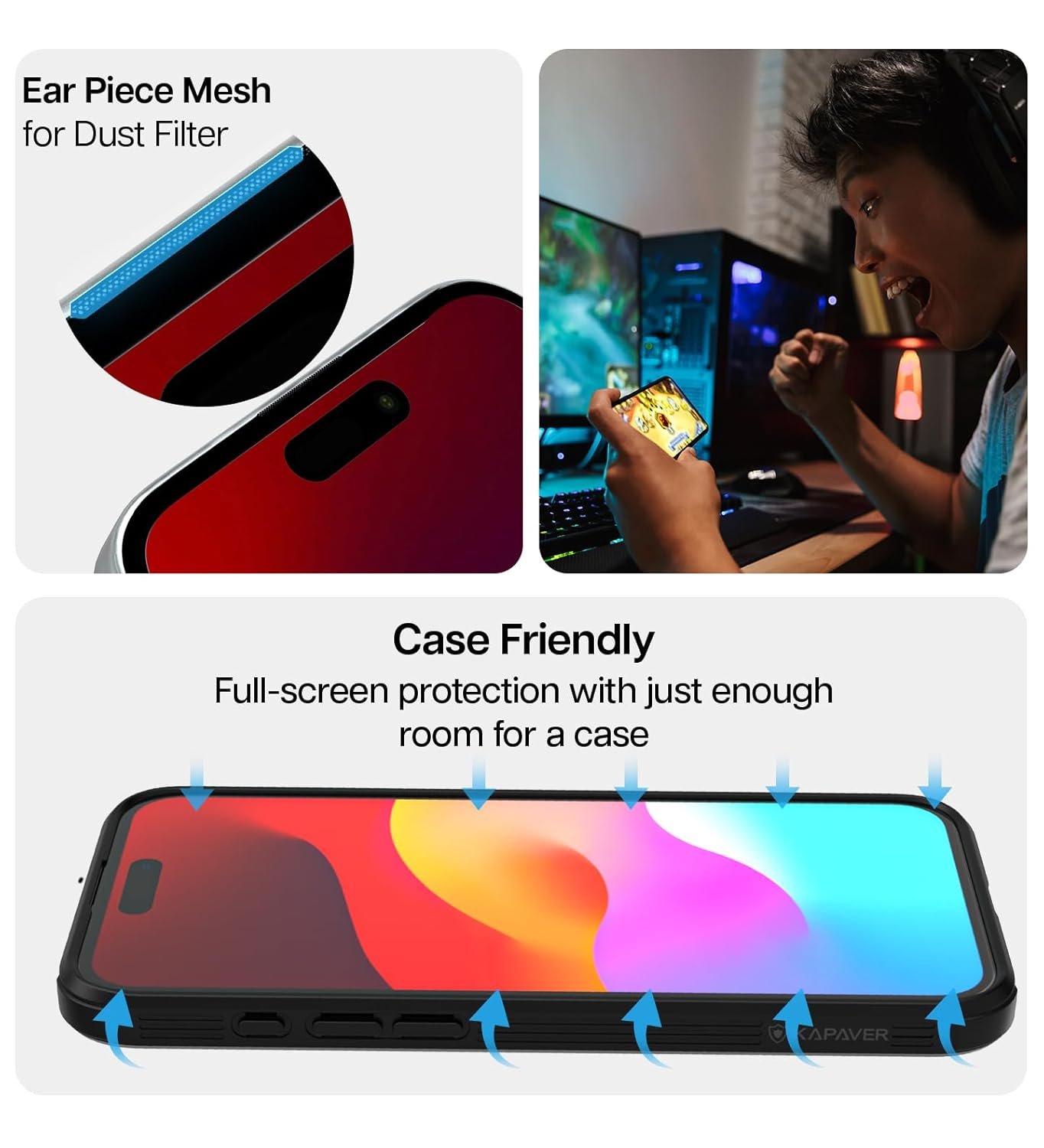 The KAPAVER Tempered glass are specially made with reinforced glass. The rounded edges deliver a more precise fit and prevent chipping from daily use. The surface hardness of 9H provides premium protection without sacrificing the “gliding” feel of oleophobic coated glass. There is no loss of touchscreen sensitivity as the silicone adhesive leaves virtually no space between the screen and the Kapaver Glass.