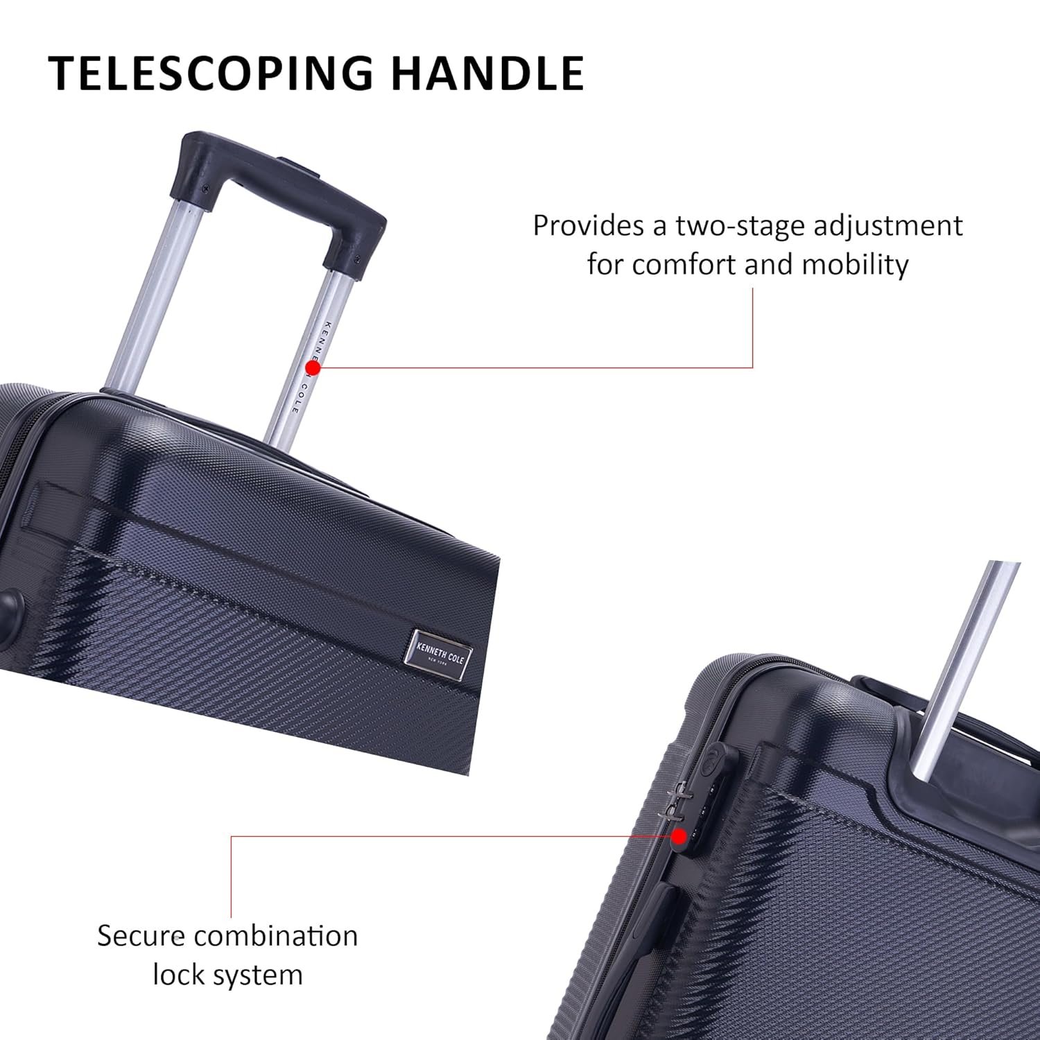 Sturdy locking retractable push-button telescopic trolley handle conductive for simple, one-handed use.