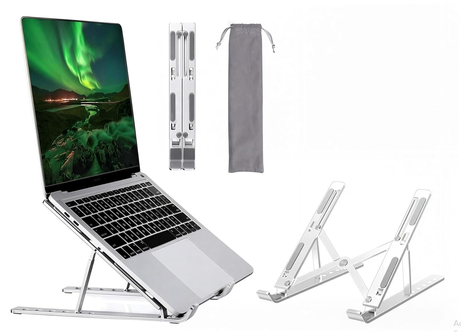Upgrade your working comfort with this 7-Angle Adjustable Foldable Laptop/Desktop Stand, designed to give you the perfect viewing height anywhere you work—office, home, café, or travel. Made from premium aluminium alloy, this sturdy yet lightweight stand provides excellent stability while keeping your laptop safe from slipping or overheating. The 7-level height adjustment allows you to choose the perfect angle for typing, video calls, studying, or long working hours, reducing strain on your neck, back, and wrists. Its open-ventilation design improves airflow and prevents your device from heating, ensuring smoother performance. The stand features anti-slip silicone pads to protect your laptop from scratches and sliding. When not in use, simply fold it into a compact, travel-friendly size and store it in your bag. It is universally compatible with all laptops and notebooks including MacBook, Dell, HP, Lenovo, Acer, Asus, and more (10–15.6 inch). This is the ideal ergonomic accessory for students, professionals, gamers, content creators, and anyone who spends long hours on a laptop.