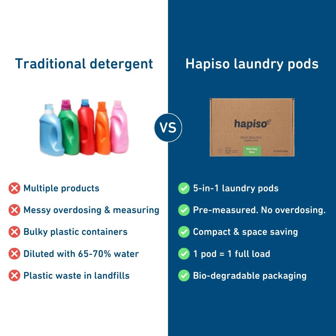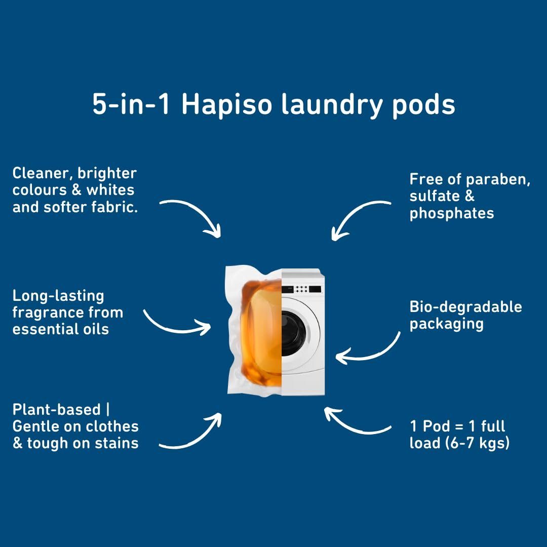 ✅ POWERFUL 5-IN-1 LIQUID DETERGENT CLEANING Hapiso Laundry Pods deliver the cleaning strength of a liquid detergent in a convenient pod format. These 5 in 1 laundry pods act as detergent, stain remover, colour protector, fabric conditioner and fragrance booster for everyday washing needs.