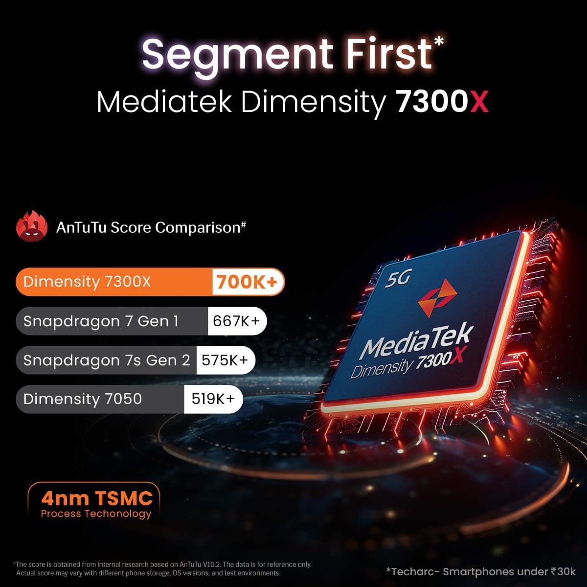 Impeccable Performance & Thermal Management: Segment’s 1st powerful Dimensity 7300X processor, LPDDR5 RAM & UFS3.1 Storage with Large Vapour Chamber Cooling Technology