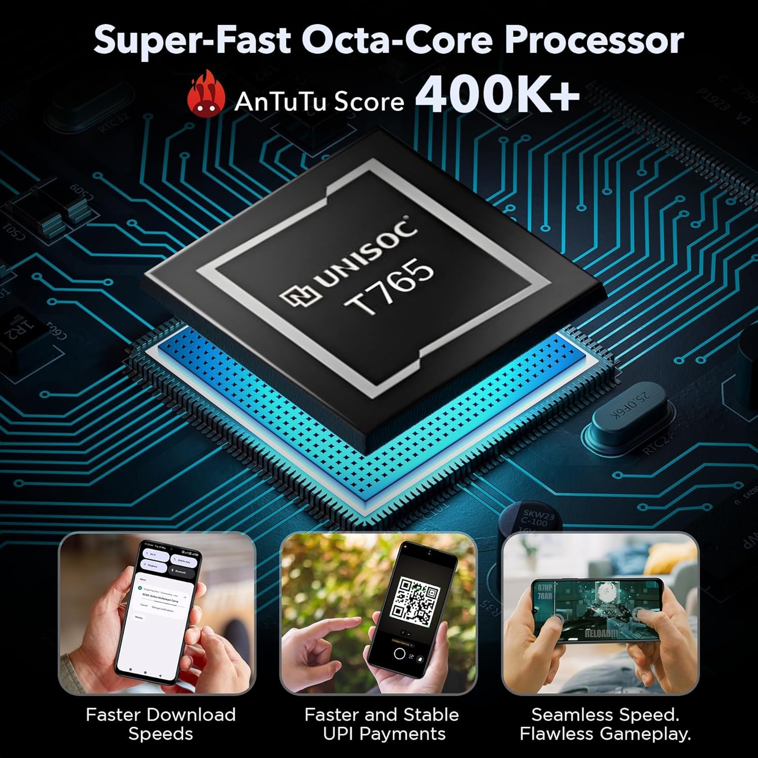 Powerful UNISOC T765 Octa-Core Processor with an impressive 380,000+ AnTuTu score, delivering effortless multitasking and reliable performance.