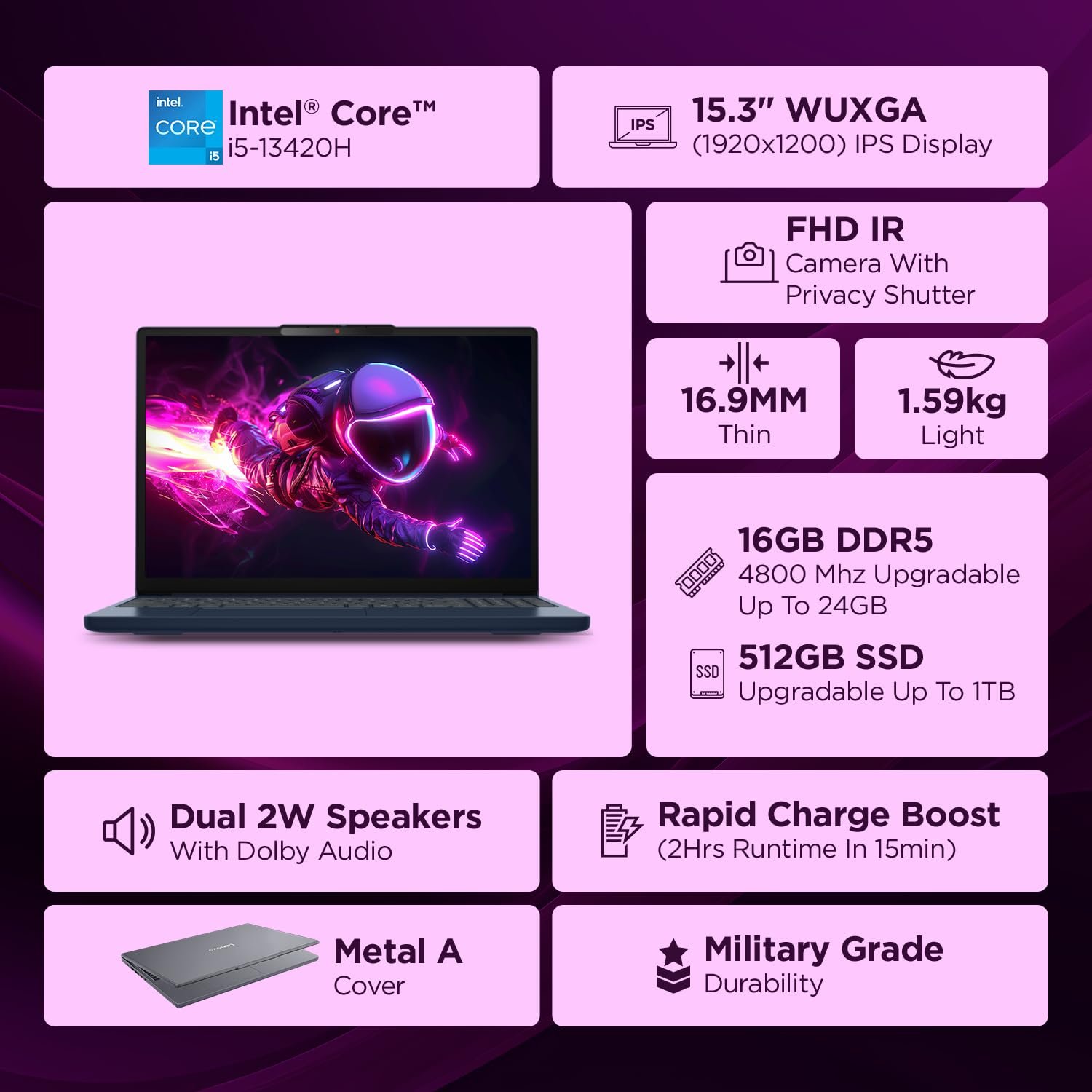 Memory and Storage: 8GB Soldered DDR5-4800 + 8GB SO-DIMM DDR5-4800, Max Memory Up to 24GB (8GB soldered + 16GB SO-DIMM) DDR5-4800 offering | 512GB SSD M.2 2242 PCIe 4.0×4 NVMe (Expandable upto 1TB)