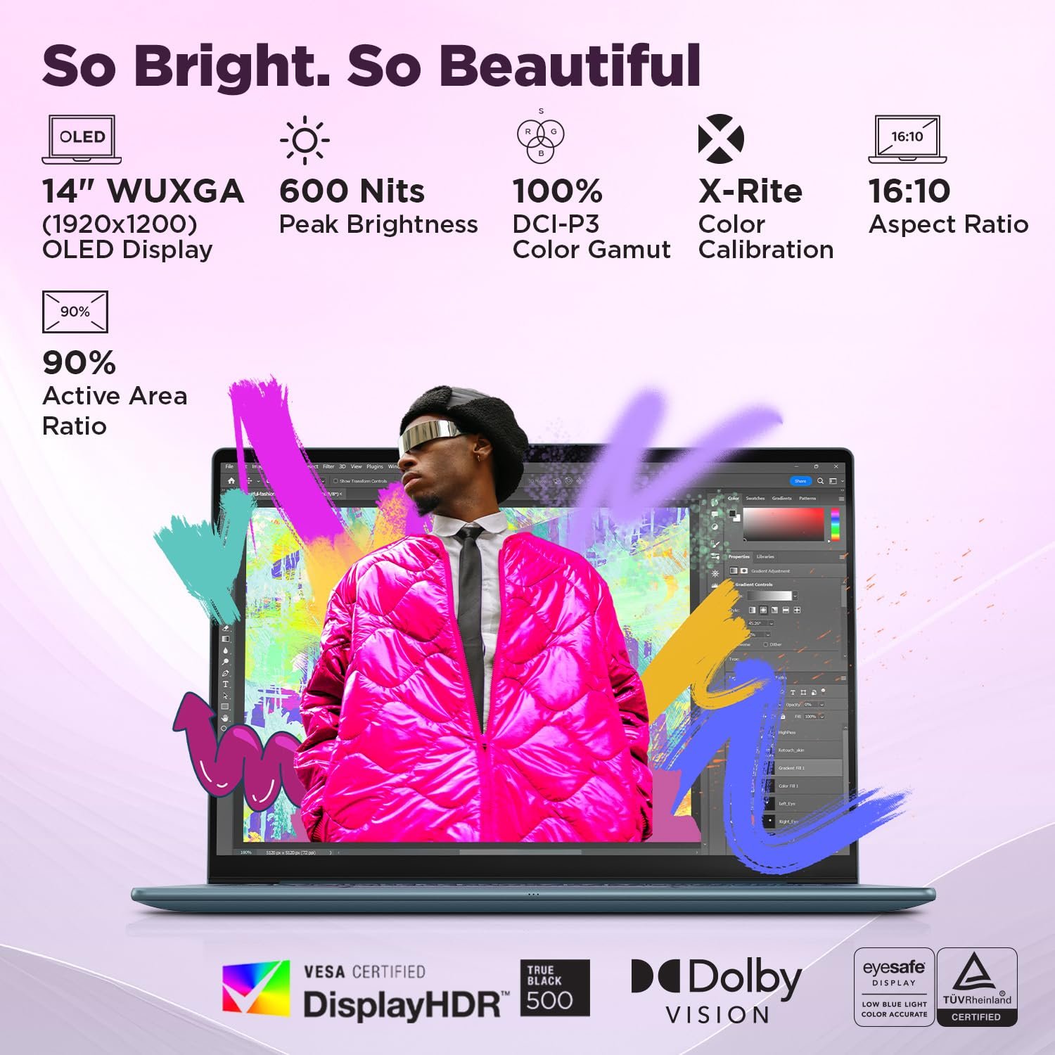 Display: 14″ WUXGA OLED (1920×1200) | 400Nits Typical Brightness, 600Nits Peak Brightness | 100% DCI-P3 |DisplayHDR True Black 500 | Dolby Vision | Anti Glare |TUV Low Blue Light Certified