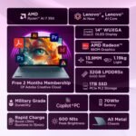 Find your creative groove with the Yoga Slim 7. Powered by AMD Ryzenâ„¢ AI 300 Series processors, it delivers seamless performance. The 14″ OLED display offers flawless color accuracy, 120Hz refresh, HDR brilliance, and TÜV low blue light tech. Lightweight, durable, and with up to 22.5 hours of battery, it’s built for creativity on the go