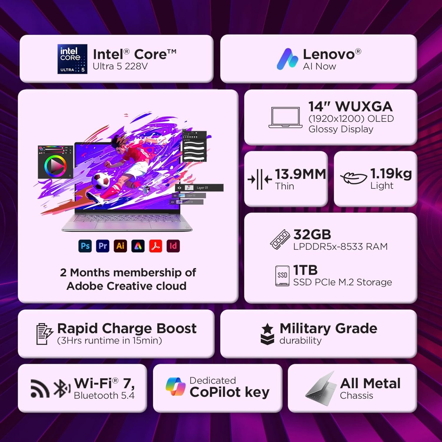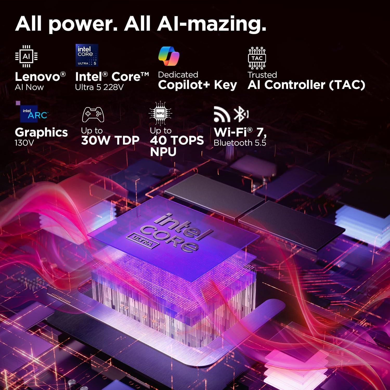 Processor: Intel Evo Core Ultra 5 228V | 8C (4P + 4LPE) / 8T, Max Turbo upto 4.5GHz | 8 Cores | 8 Threads | Cache: 8MB || NPU: Integrated Intel AI Boost, up to 40 TOPS