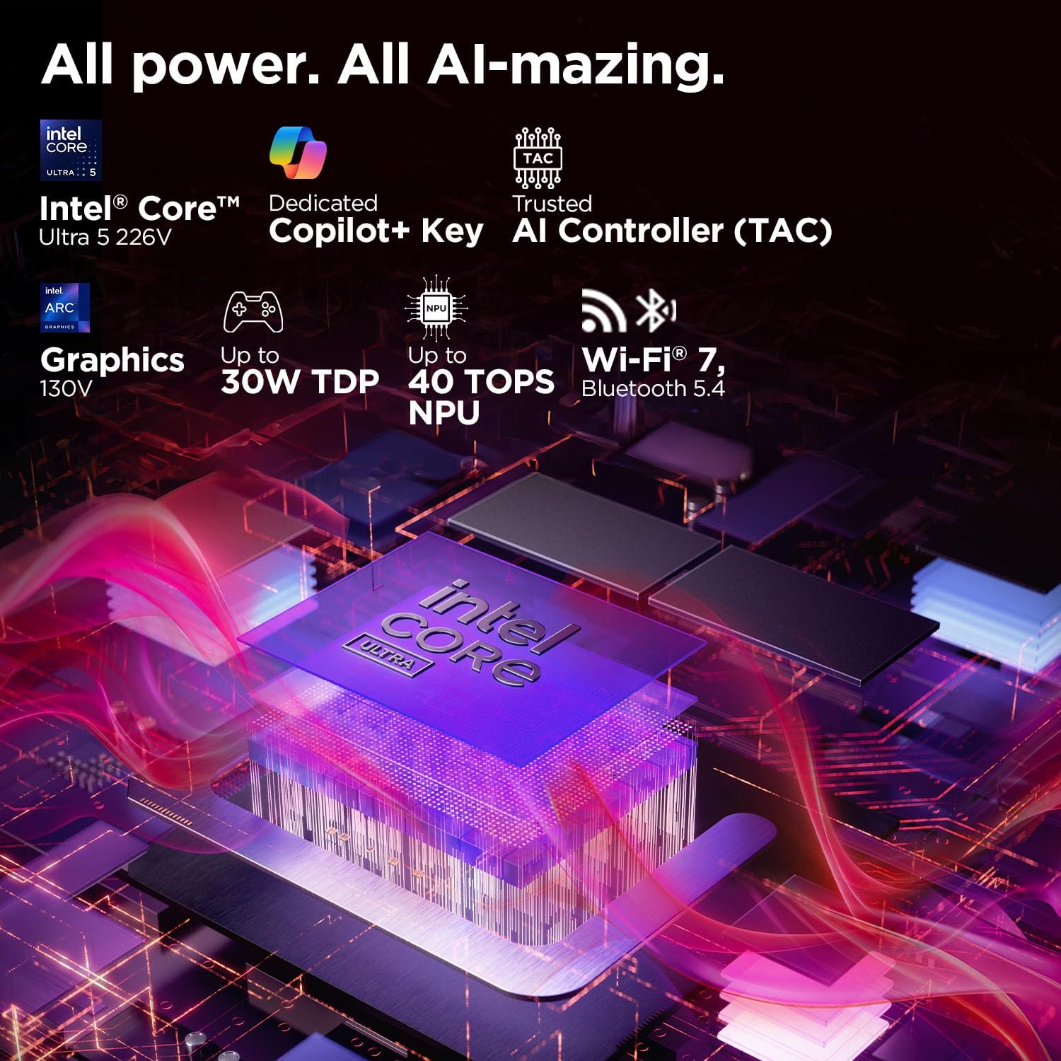 Processor: Intel Evo Core Ultra 5 226V | 8C (4P + 4LPE) / 8T, Max Turbo upto 4.5GHz | 8 Cores | 8 Threads | Cache: 8MB || NPU: Integrated Intel AI Boost, up to 40 TOPS