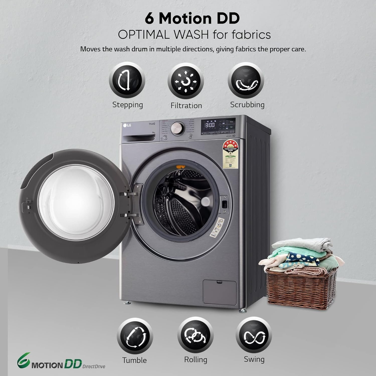 Wash Programs: 14 No. of Programs – Cotton, Cotton+, TurboWash 59, Mixed Fabric, Easy Care, Allergy Care, Baby Steam Care, Delicates, Hand/Wool, Speed 14, Dry Only, Wash+Dry (5 Kg), Tub Clean & Download Cycle | Can be downloaded multiple wash programs using LG ThinQ App