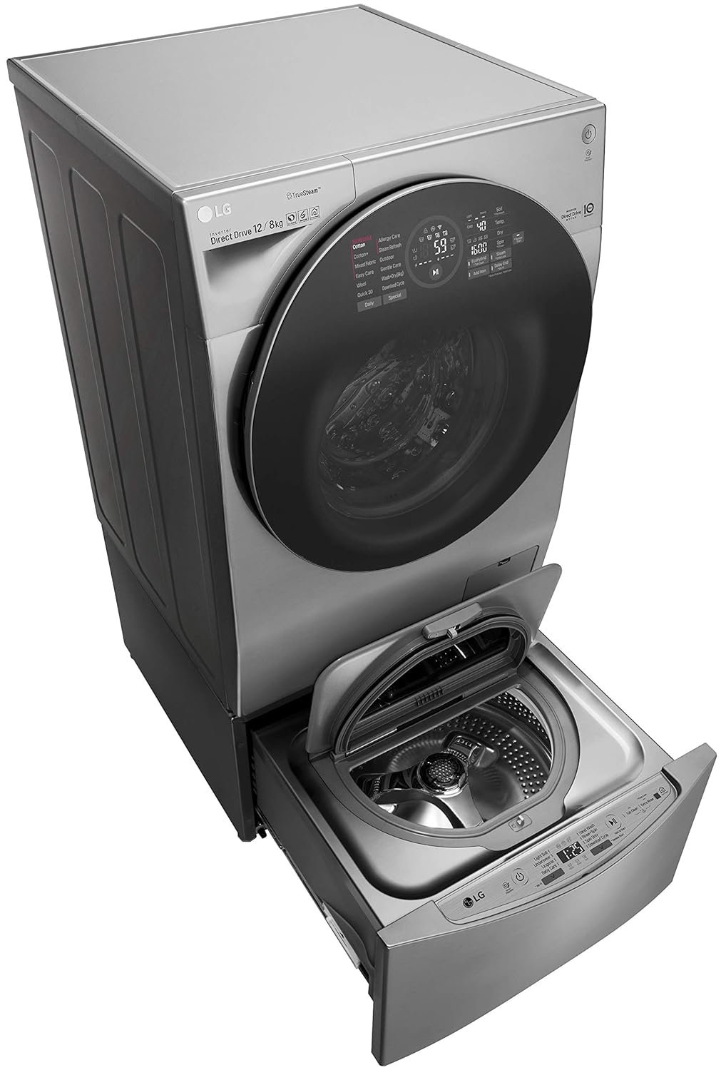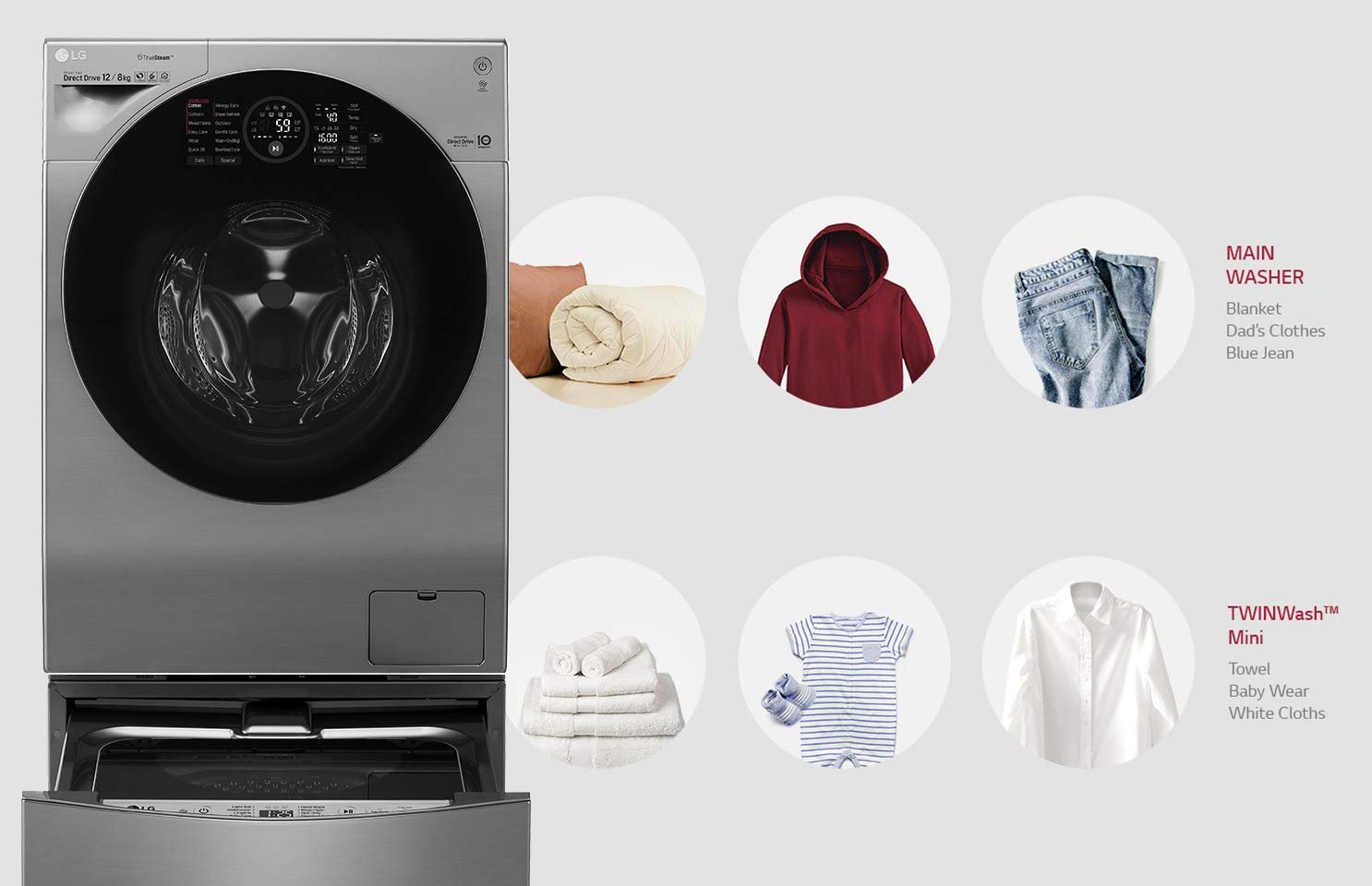 Revolutionary TwinWash comes with a combo of Front load as the main washer & top Load as the mini washer.