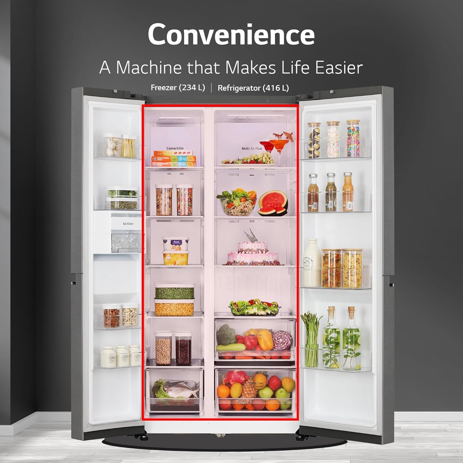 Capacity 650 L: Suitable for families with 5 or more members I freezer capacity: 234 L, fresh food capacity: 416 L
