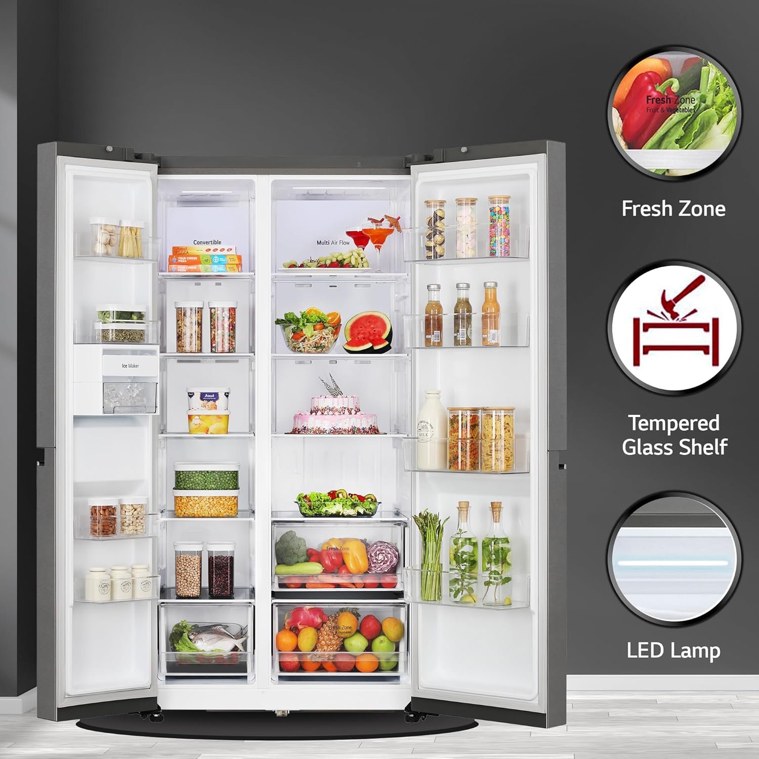Special Features: Convertible – Offers you more space to suit your needs | Adjustable shelves, Twist Ice Maker, inverter, Temperature control, Interior LED, Pocket Handle, LED Display, Child Lock, Door Alarm, Deodorizer, Ice Tray