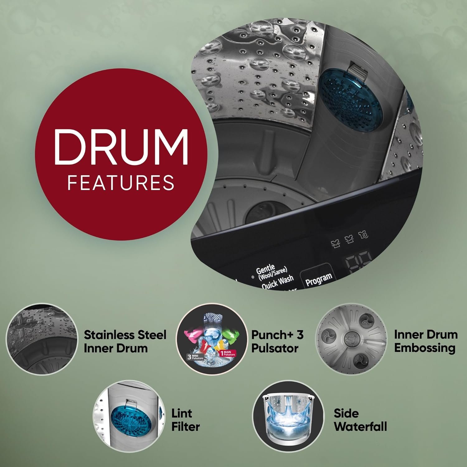 Drum: Stainless steel | Pulsator type: Punch +3 Pulsator| Body: Steel | Door type: Black Tempered Glass | Smart Inverter Motor: Less noise & vibration, More durability; water proof motor doesn’t corrode and is the most durable; Top load fully-automatic washing machine for this monsoon | Washer Dispenser Options: Detergent / Liquid Detergent, Fabric softener and / or bleach