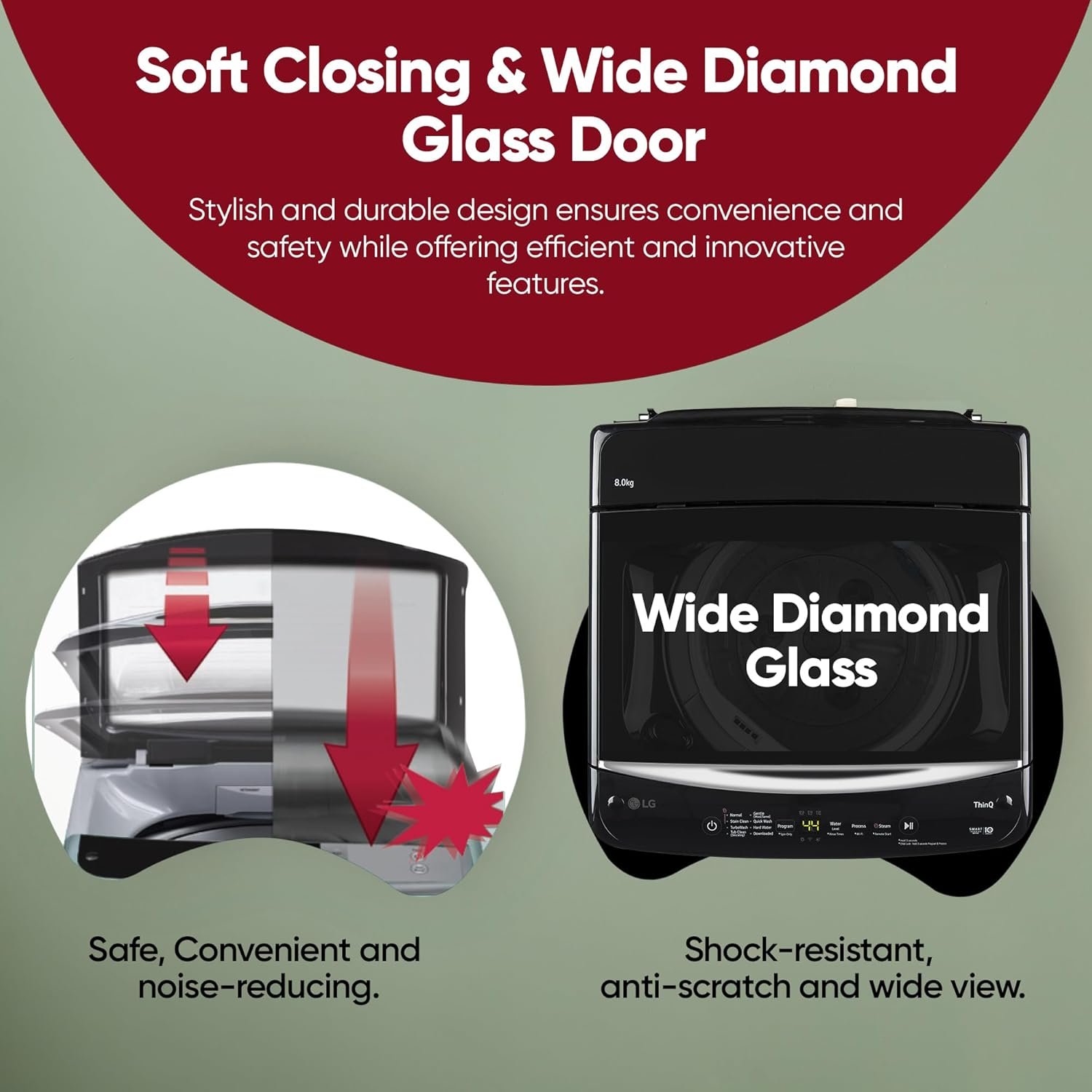 Prevents sudden lid slams with smooth, gentle closing for added safety and convenience in lg top load washing machine.
