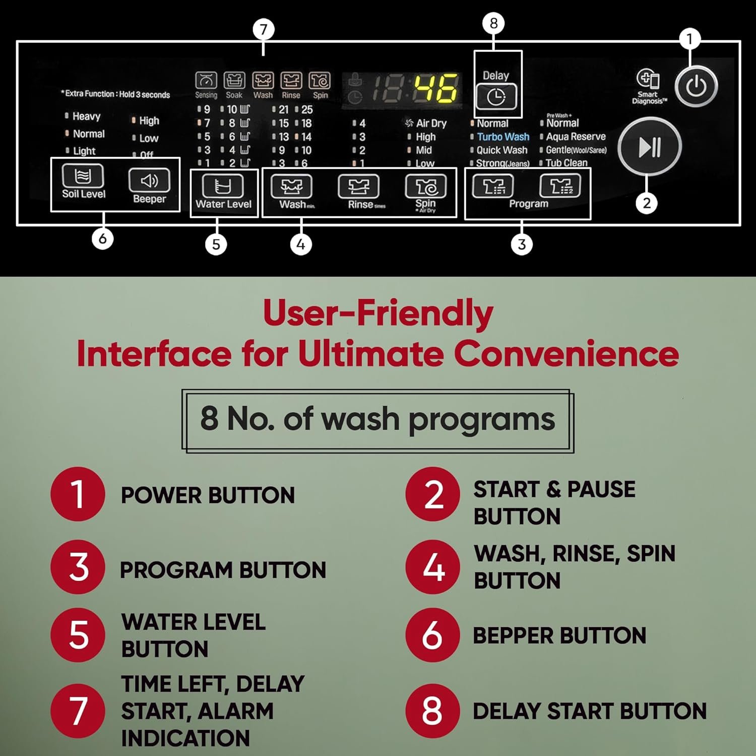 Additional Features: Delay Timer – 3-19 hours; Top Load Washer; Auto Pre Wash; Foam detection system; LoadSense; Leveling Legs; Water feed (Hot / Cold); Lint Filter; Side Water Fall; Soft Closing & Wide Diamond Glass Door; Child Lock; Standby Power Save; Auto Restart; Door opening safety feature especially in case of emergency or power restoration delay; Silent operation