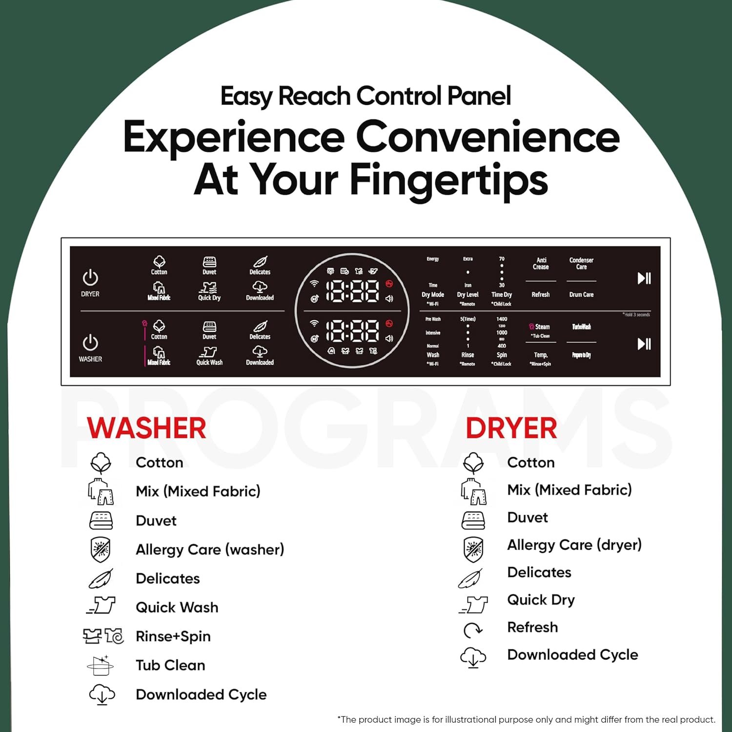 Wash Programs : Cotton, Duvet, Delicates, Mix Fabric, Quick Wash, Download Cycle | Dry Programs : Cotton, Duvet, Delicates, Mixed Fabric, Quick Dry, Downloaded Cycle